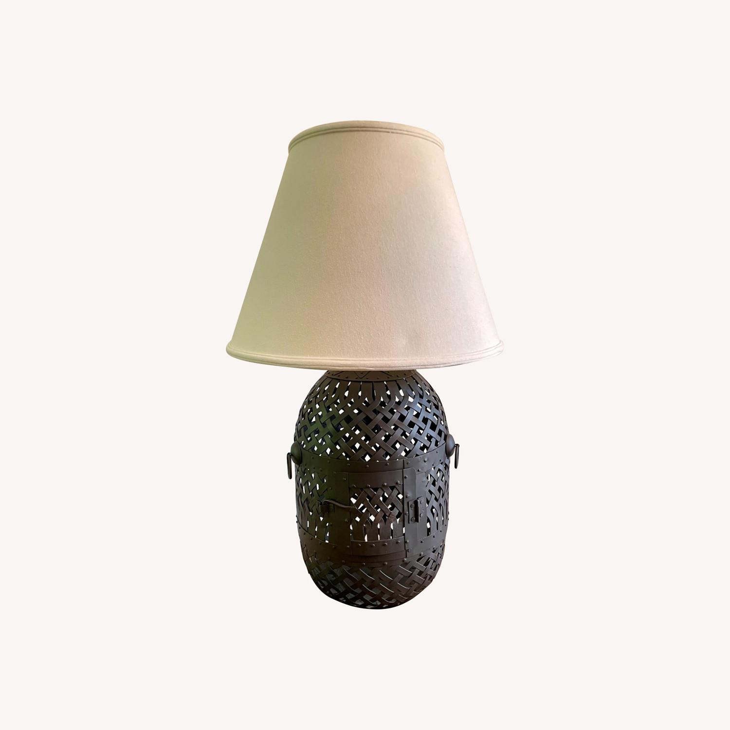 Seller's Notes:Looking for a stylish lamp to add to your home decor? The Pottery Barn Bronze Metal Cage Table Lamp is a great option! Its contemporary design and warm bronze finish add sophistication to any room. With a unique cage-like structure and functional small door, this lamp is both distinctive and functional. Plus, it comes with a Textured Gallery Tapered Shade made of 100% linen and lined with styrene, measuring 11 inches in diameter at the top, 19.5 inches in diameter at the bottom, and 14 inches high. The lamp stands 34 inches tall in total and is in excellent working condition, making it a perfect addition to your home.