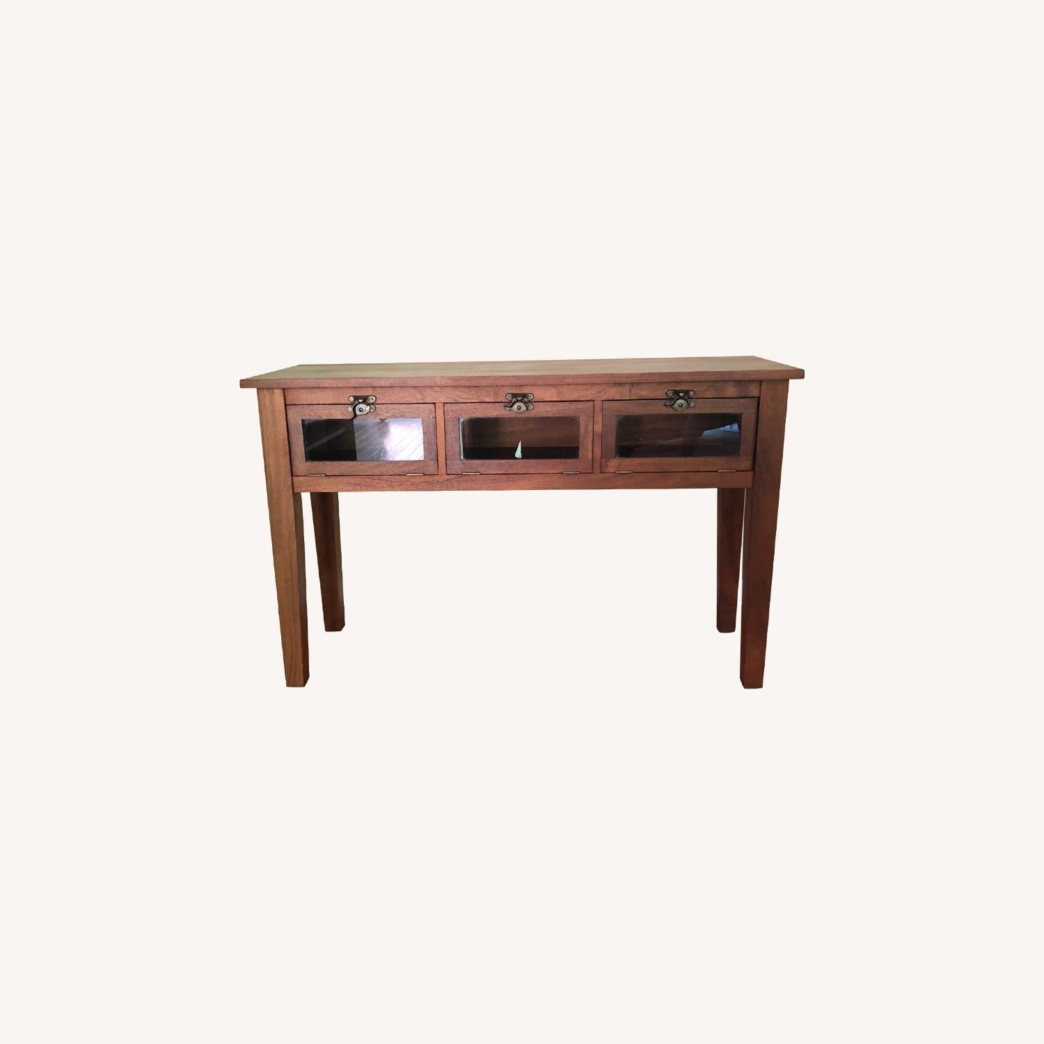 Seller's Notes:Pottery barn solid wood table has three windows with latches for a unique side table in a living room, entryway or dining room. 48"W x 16"D x 30"H