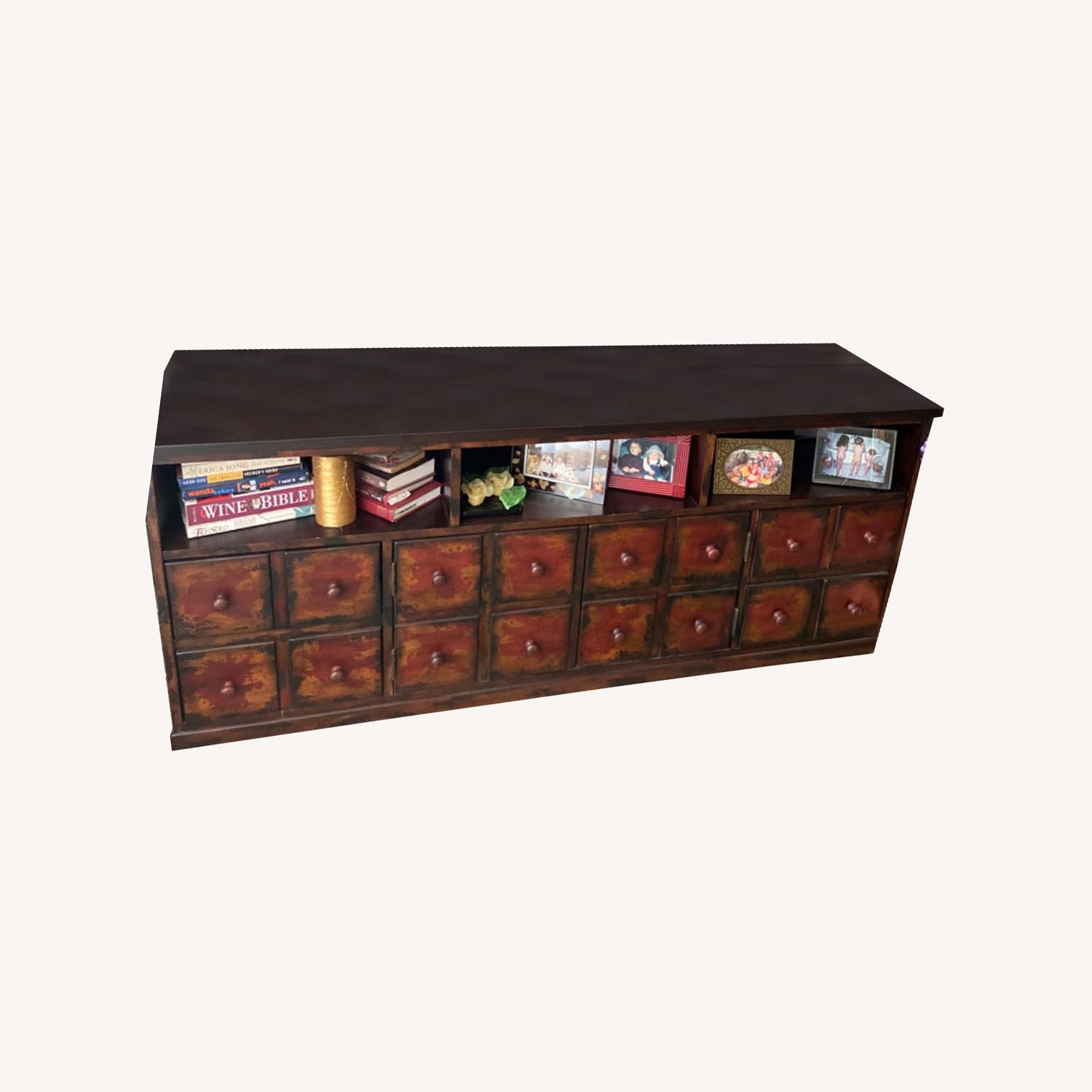 Seller's Notes:This is an amazing and truly impossible to find Pottery Barn cabinet. It has a brick red patina look upon the wood and has knobs, shelves, drawers, and shutters. Nearly pristine condition.