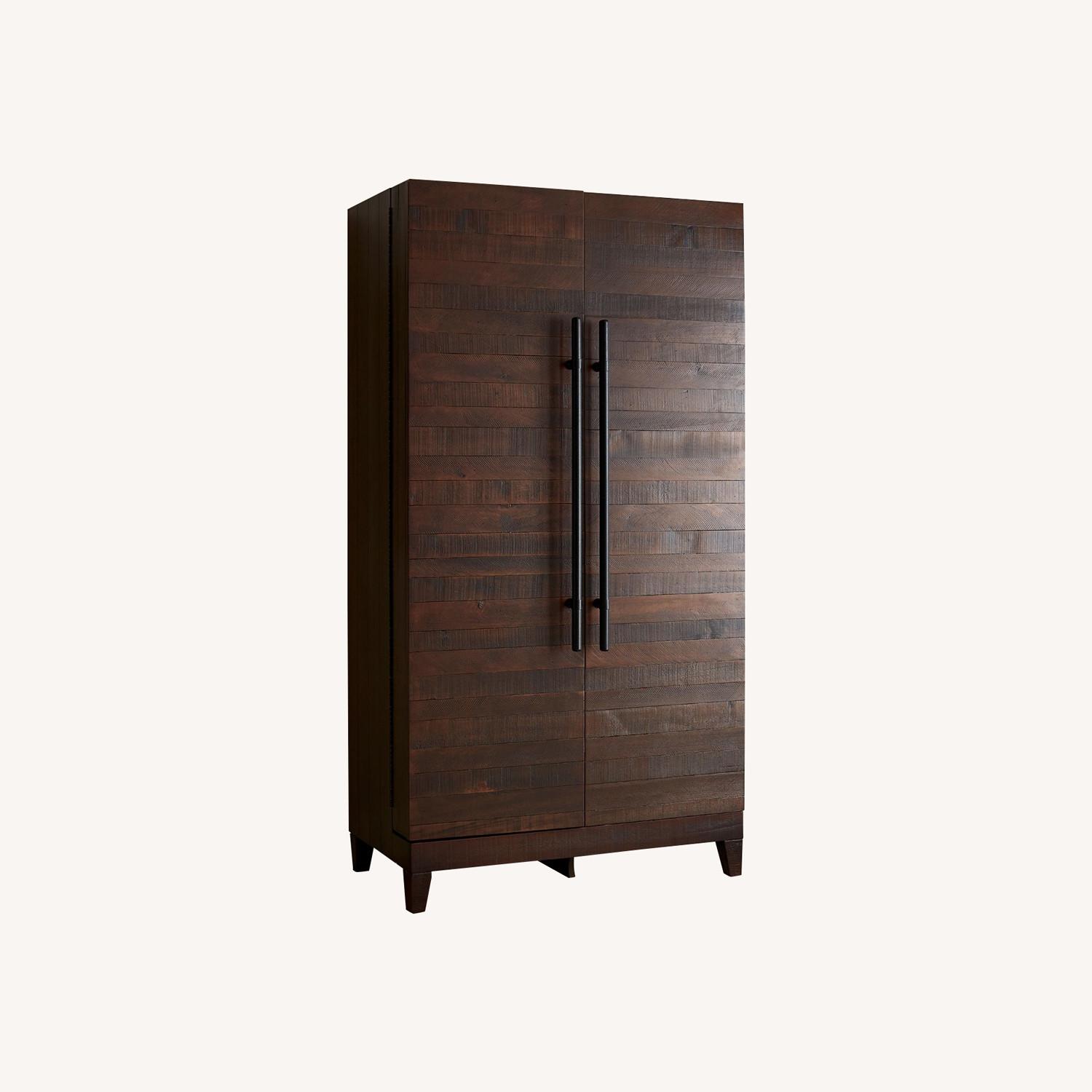 Seller's Notes:Made of solid poplar, MDF and birch veneers. Crafted of poplar, a medium-density hardwood that’s straight-grained and uniform in texture. MDF is an engineered wood that lends exceptional strength and ensures the product’s structural integrity over time. The use of veneers results in high-quality furniture that has flawless surfaces and consistent color tones and is not subject to cracking. Finish is an oil based reclaimed brown; hardware has a black finish. Top interior is backed with a mirror. Constructed with mortise-and-tenon joinery. Features glass shelves, 8 stemware racks and 2 drawers. 3 LED integrated lights are controlled by a pressure switch. Lights will shut off automatically when the doors have closed. Adjustable levelers provide stability on uneven surfaces. Anti-tip kit included: comes with safety-tested mounting hardware, instructions and a nylon strap. To prevent injuries from furniture tip-over, this item should be permanently fixed to the wall.