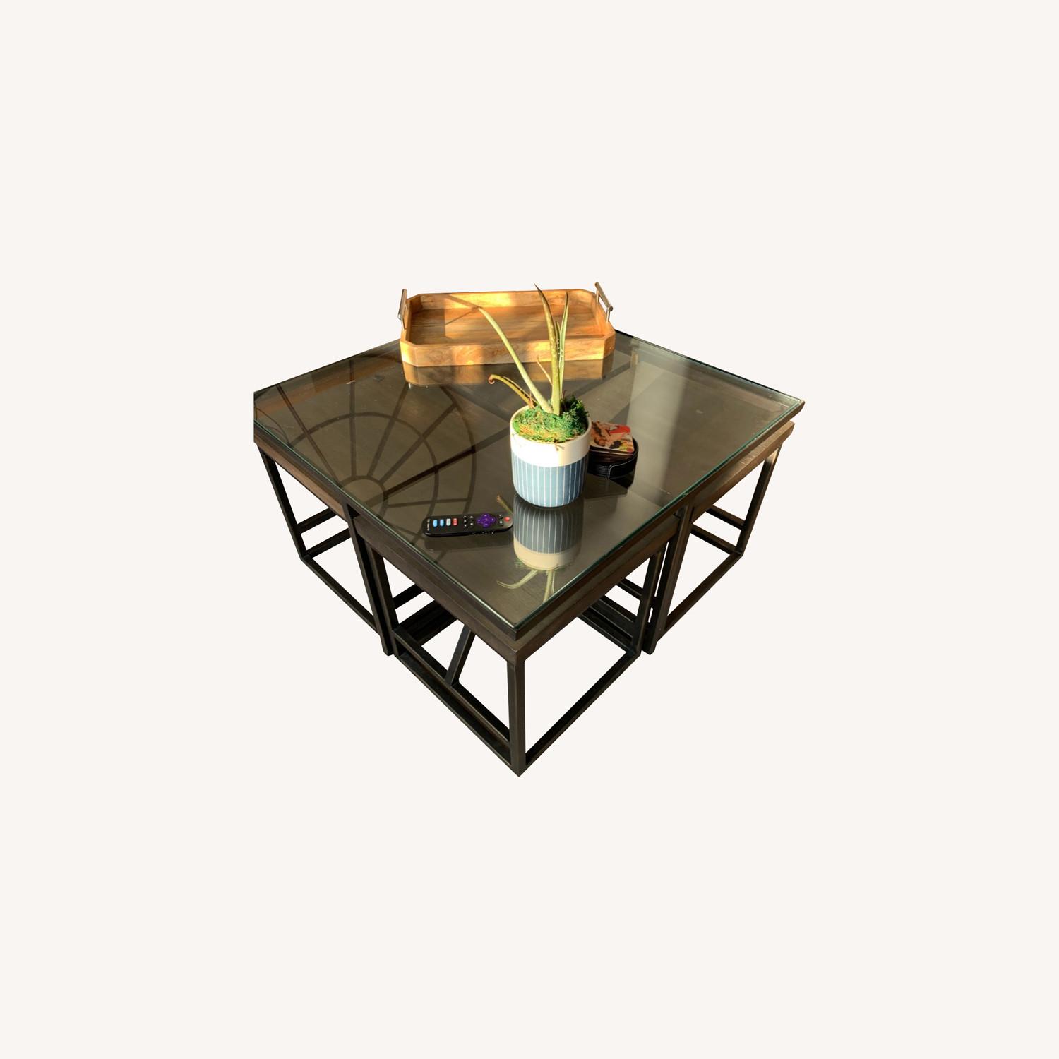 Seller's Notes:Massive moving sale! Beautiful glass top, multi-functional solution for smaller spaces, four stools with wooden tops that double as side tables or extra seating for entertaining. One year old, excellent condition except for one scratch where wood was removed (see photo), easily fixable with glue (wood piece still available).