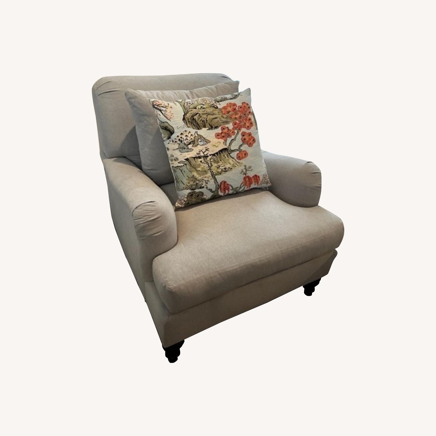 Seller's Notes:Less than 2 years old. 2 Pottery Barn Carlisle Upholstered Armchairs, in Down Blend Wrapped Cushions, with Brushed Crossweave Fabric, in Light Gray. Immaculate condition, super comfortable, and just like new. One of the two chairs has a small piece of the back chair foot knicked off, but it appears to be an easy fix if you even choose to fix it. It's really not noticeable.