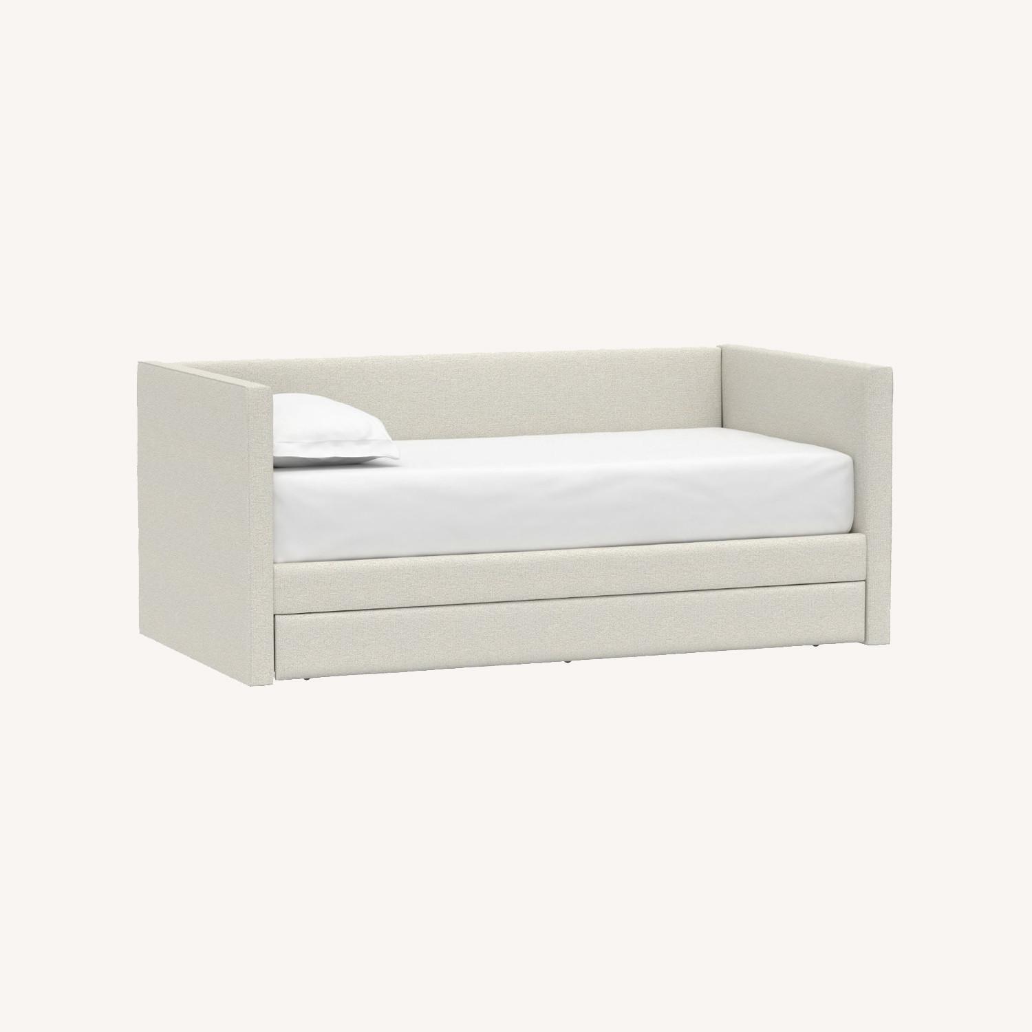 Seller's Notes:Carter Daybed and Trundle in Performance Boucle Oatmeal Simple, modern and versatile, the Carter Square Daybed features clean lines, along with plush, padded comfort. The wraparound back and arms shelter a deep seat with a roll-out trundle below, which is great for storage or as a guest bed when you add our trundle mattress (sold separately). Masterfully crafted for enduring quality and style, the daybed features a sustainable-wood frame, hand-applied finishes and expertly tailored upholstery. HOW IT IS CONSTRUCTED Expertly crafted with a kiln-dried solid pine and engineered wood frame. Headboard, footrail and side rails are thickly padded and tightly upholstered. Mattress area is covered in black lining. Upholstered on all sides. GREENGUARD Gold Certified to contribute to healthier indoor air, keeping you and your family safer. DETAILS THAT MATTER New Fabrics for the Season: Performance Boucle. Daybed and trundle accommodate a twin size mattress (sold separately). Do not use a box spring for daybed or trundle. Trundle offers generous storage space for toys, clothes, bedding and more when used without a mattress. Trundle is fitted with rolling casters that make it easy for kids to open up and put away by themselves. KEY PRODUCT POINTS Pottery Barn Kids exclusive. Recommended maximum weight Twin bed: 500 lbs. All Pottery Barn Kids juvenile products are tested at 3rd party CPSC accredited labs to meet or exceed all industry voluntarily and regulatory safety requirements. Imported.