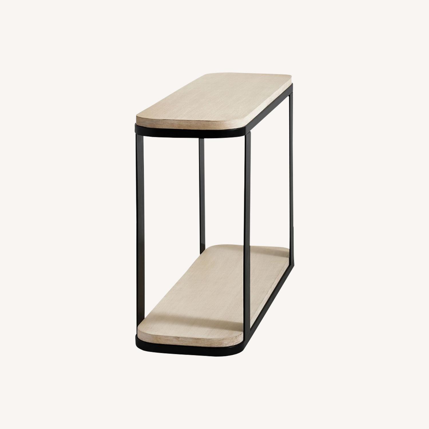 Seller's Notes:Frame is crafted from wrought iron with MDF mango veneers for top and bottom shelves. Top and shelf are finished in multi-step process in water-based Biscotti. Frame is powder-coated Matte Black. MDF is an engineered wood that lends exceptional strength and ensures the product’s structural integrity over time. Kiln-dried wood helps prevent warping, splitting, cracking and developing mildew. The use of veneers results in high-quality furniture that has flawless surfaces and consistent color tones that will not be subject to cracking. Adjustable levelers provide stability on uneven surfaces.