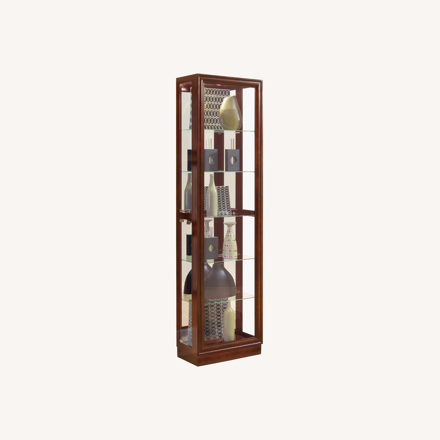 Seller's Notes:Expertly crafted from solid poplar, veneers, MDF, mirrored glass and clear beveled glass; hand finished in Cherry. Features a side entry door, mirrored back, 1 mounted light, and 5 adjustable shelves. MDF is an engineered wood that lends exceptional strength and ensures the product's structural integrity over time. Kiln-dried wood helps prevent warping, splitting, cracking and developing mildew. The use of veneers results in high-quality furniture that has flawless surfaces and consistent color tones that will not be subject to cracking. Includes 1 plug-in halogen light.
