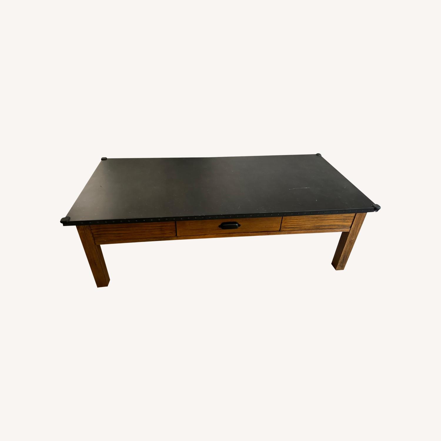Seller's Notes:Love it, but I’m converting the room to a playroom and it no longer has a place Heavy solid wood with metal riveted top One significant scratch on metal top as pictured, but I’ve had a tray on top and it’s not noticeable. Otherwise just superficial marks on the top.