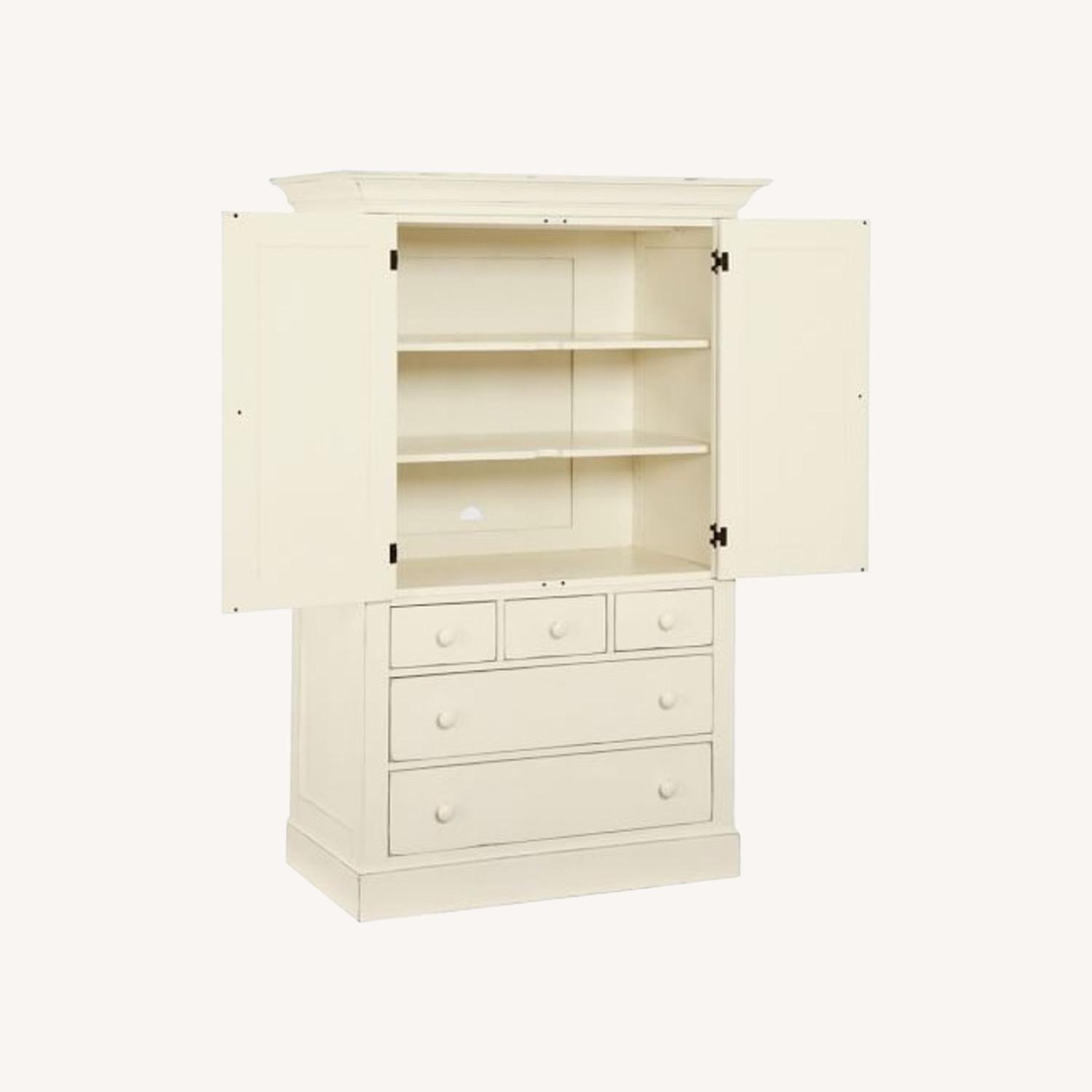 Seller's Notes:Lightly used in guest bedroom. Beautiful solid heirloom quality piece. Off white / cream color. Hand finished in our exclusive Artisan Lacquer for color that’s richly saturated, Finished by hand using an exclusive multistep process that results in exceptional depth of color, then sealed with a protective lacquer. With a removable clothing pole, cord cutouts and wraparound doors, the armoire can also serve as a media center. Details Overall: 46" wide x 26" deep x 72" high Cabinet Interior: 39" wide x 21" deep x 40" high Small Drawer Interior: 10.5" wide x 18" deep x 4.5" high Lower Drawer Interior: 34.5" wide x 18" deep x 6.5" high