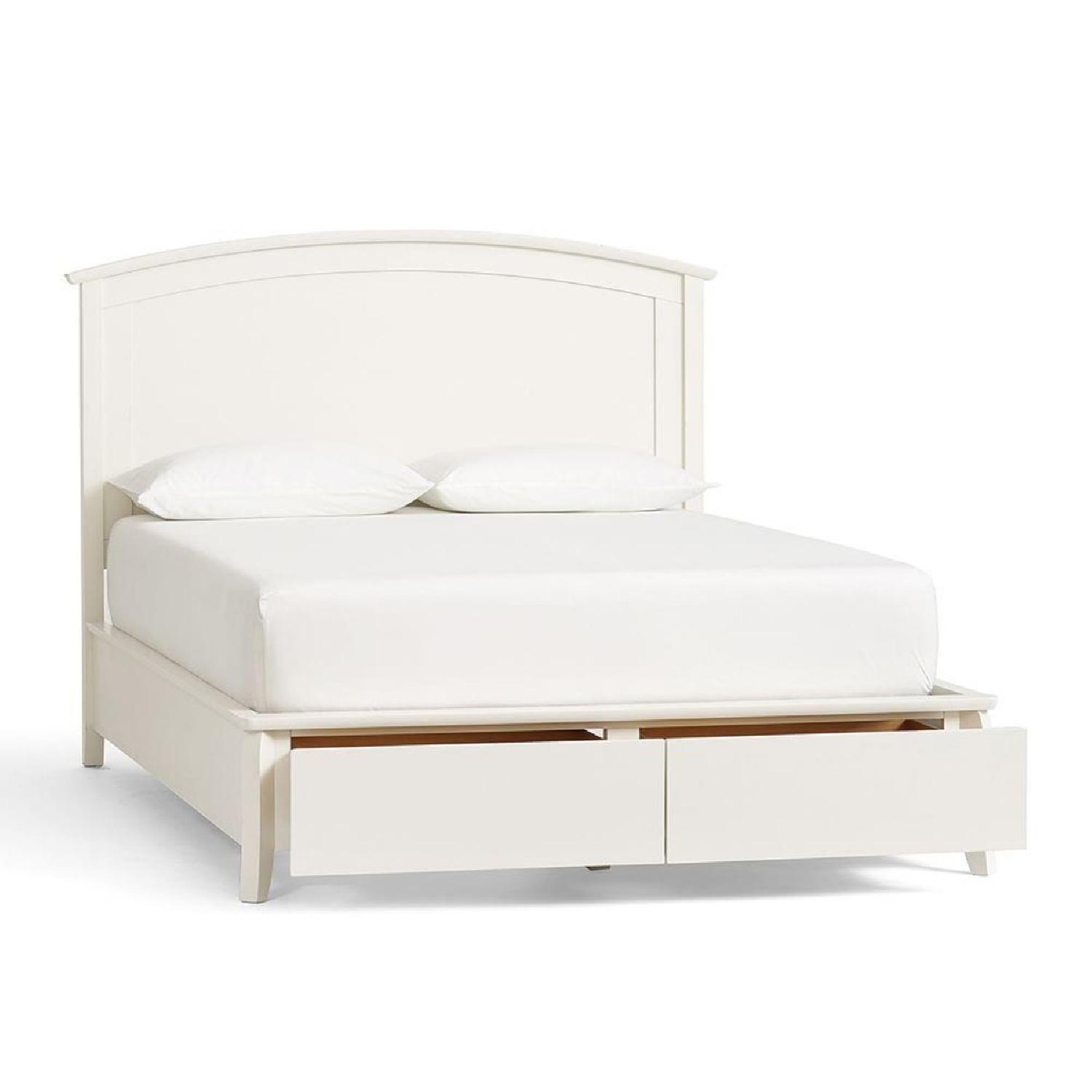 Seller's Notes:Chloe Storage Bed from Pottery Barn. White & Size Full. Two drawers at the end of the bed that are spacious. It can fit up to 7-8 sweaters (Drawer Exterior: 27" w x 20.25" d x 10" h Drawer Interior: 21.5" w x 18.75" d x 6" h) Slight scratches and chipped wood on the sides and corners, but nothing on the main headboard. Boxspring is not required.