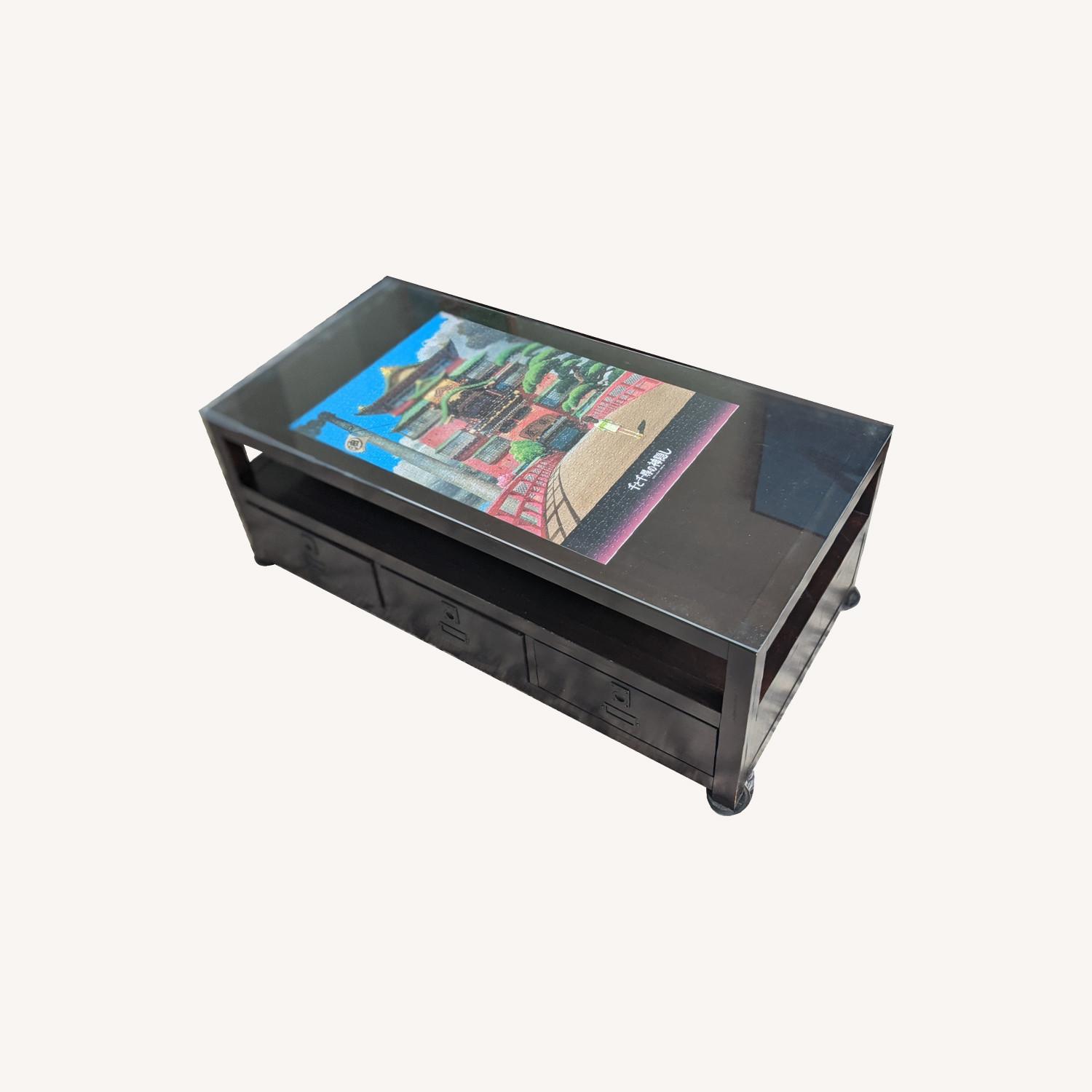 Seller's Notes:Pottery Barn Coffee Table available with storage drawers that open from either side. Map top. Item has a few surface scratches - regular wear and tear. No pets, smoking in the space. Feel free to reach out with any questions. (Puzzle not included!)