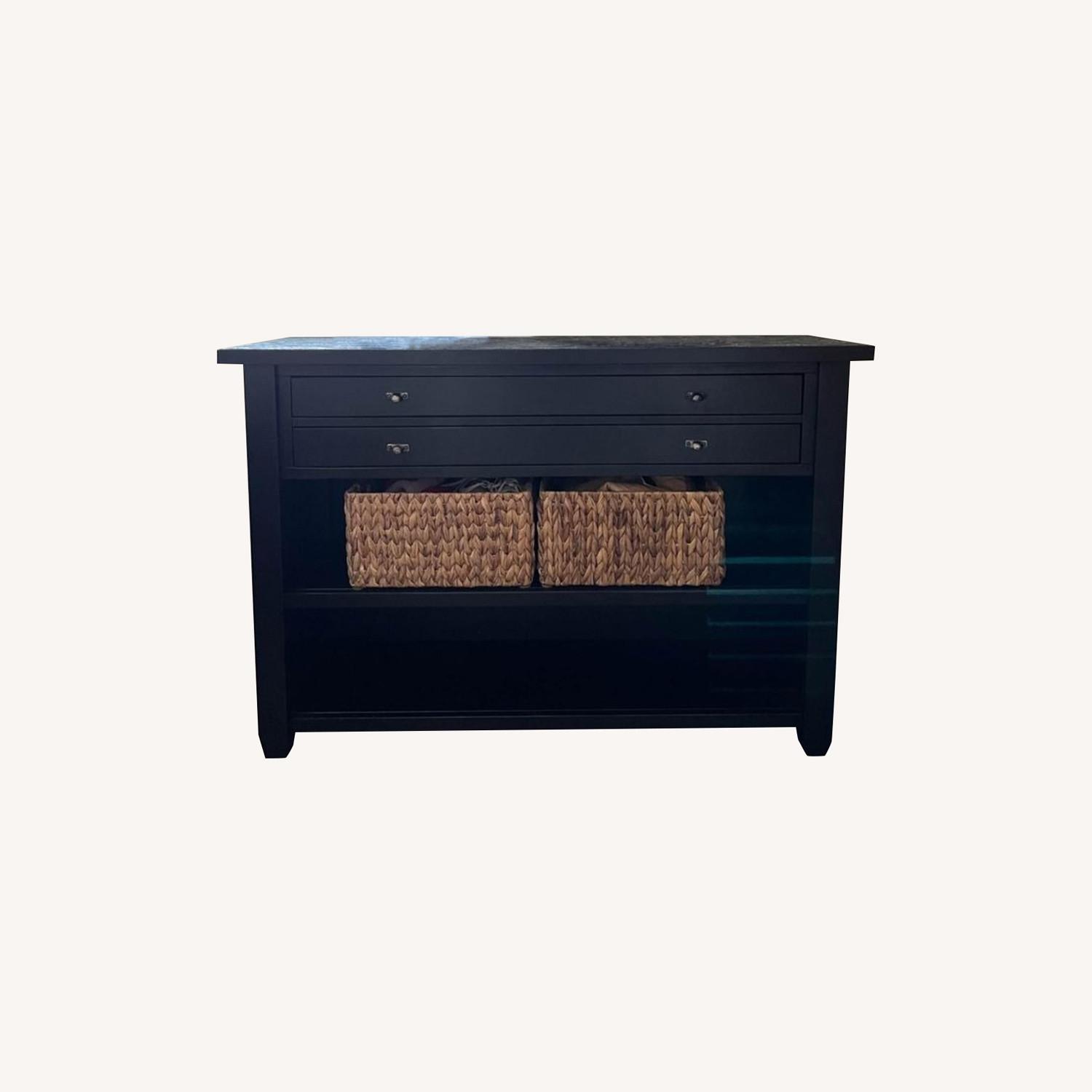 Seller's Notes:Pottery barn, refinished console table. 2 shelves, 2 drawers. Black. Very heavy. Pickup in Moraga. 50”W x 15 1/2”D x 34” T
