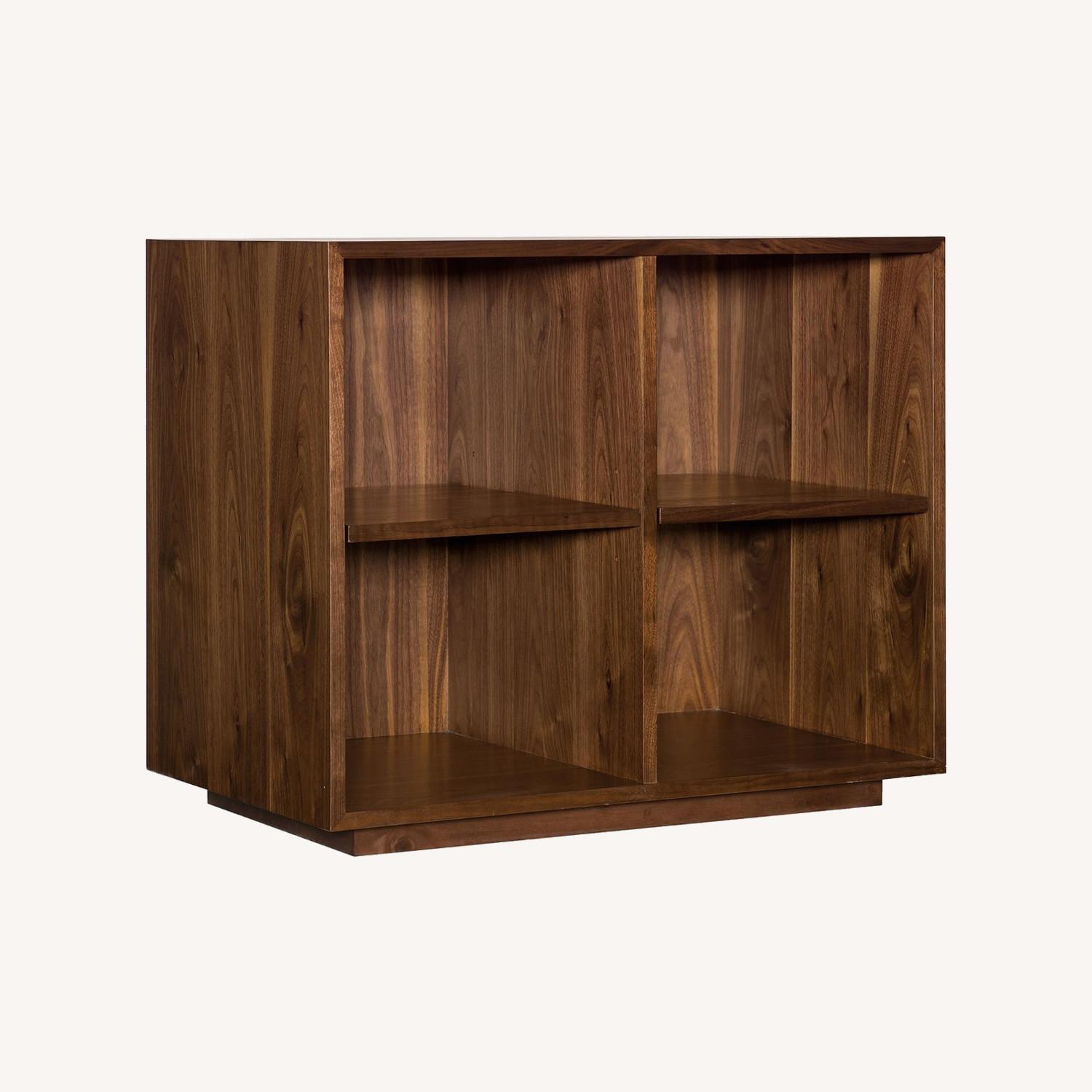 Seller's Notes:Expertly crafted from flat cut walnut veneers, rubber wood, steel and MDF. Crafted of rubberwood, a sustainably harvested and highly durable hardwood. MDF is an engineered wood that lends exceptional strength and ensures the product’s structural integrity over time. All wood is kiln-dried, a process that ensures that the furniture will never split, warp, crack or mildew. The use of veneers results in high-quality furniture with flawless surfaces and consistent color tones. Finished in oil-based semi-gloss medium wood-tone color. Open shelf cabinet features 4 open cubbies. Adjustable levelers provide stability on uneven surfaces.
