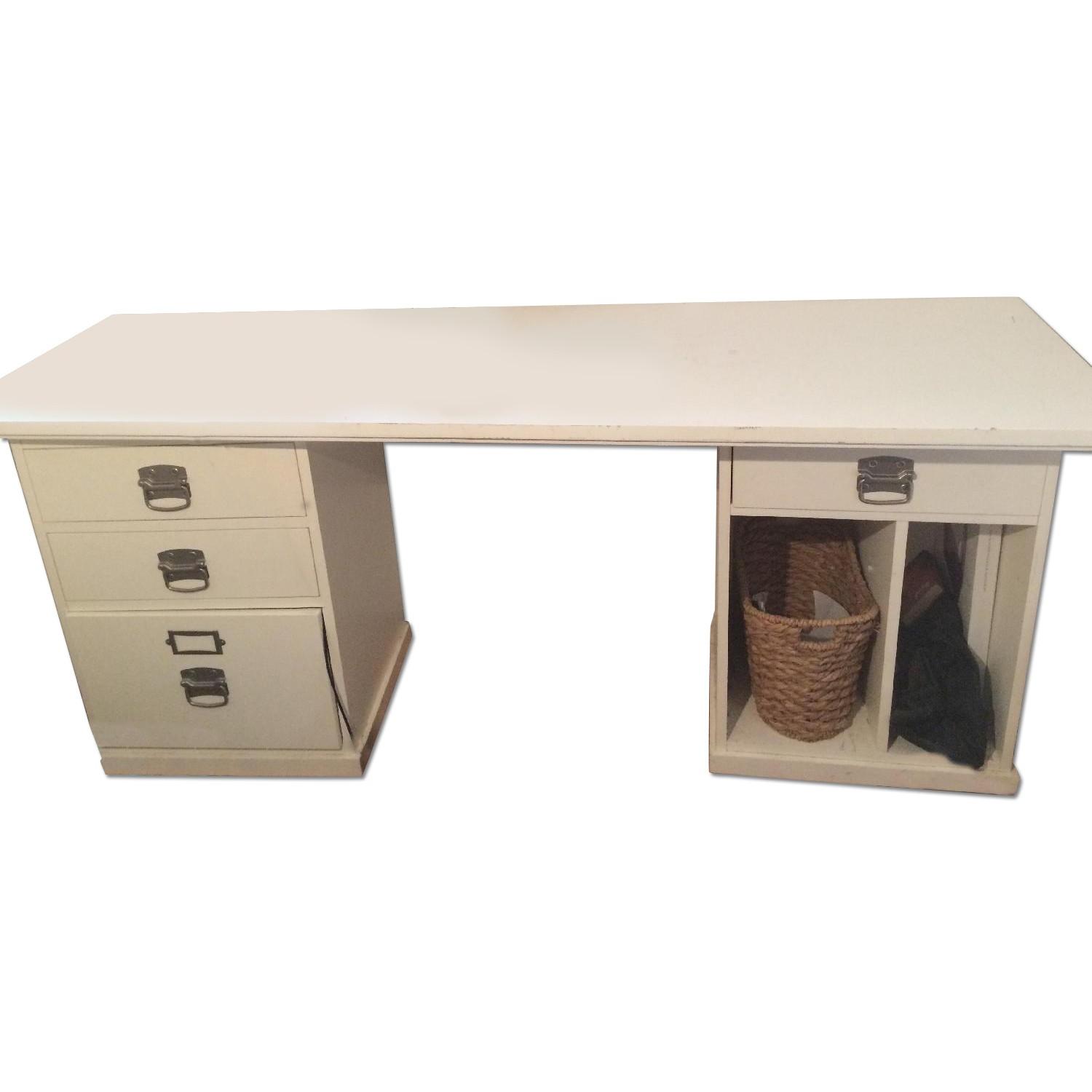 Seller's Notes:Before leaving for design school in Manhattan, I was able to convince my mother to give me the desk as a sewing table. It is spacious enough for both my home sewing machine and serger, and has many drawers for all of my supplies. Before it was mine, my mother used it as a computer desk with office supplies in the drawers. It has a little bit of water color on the top of it, but it is fixable with the right color of paint.
