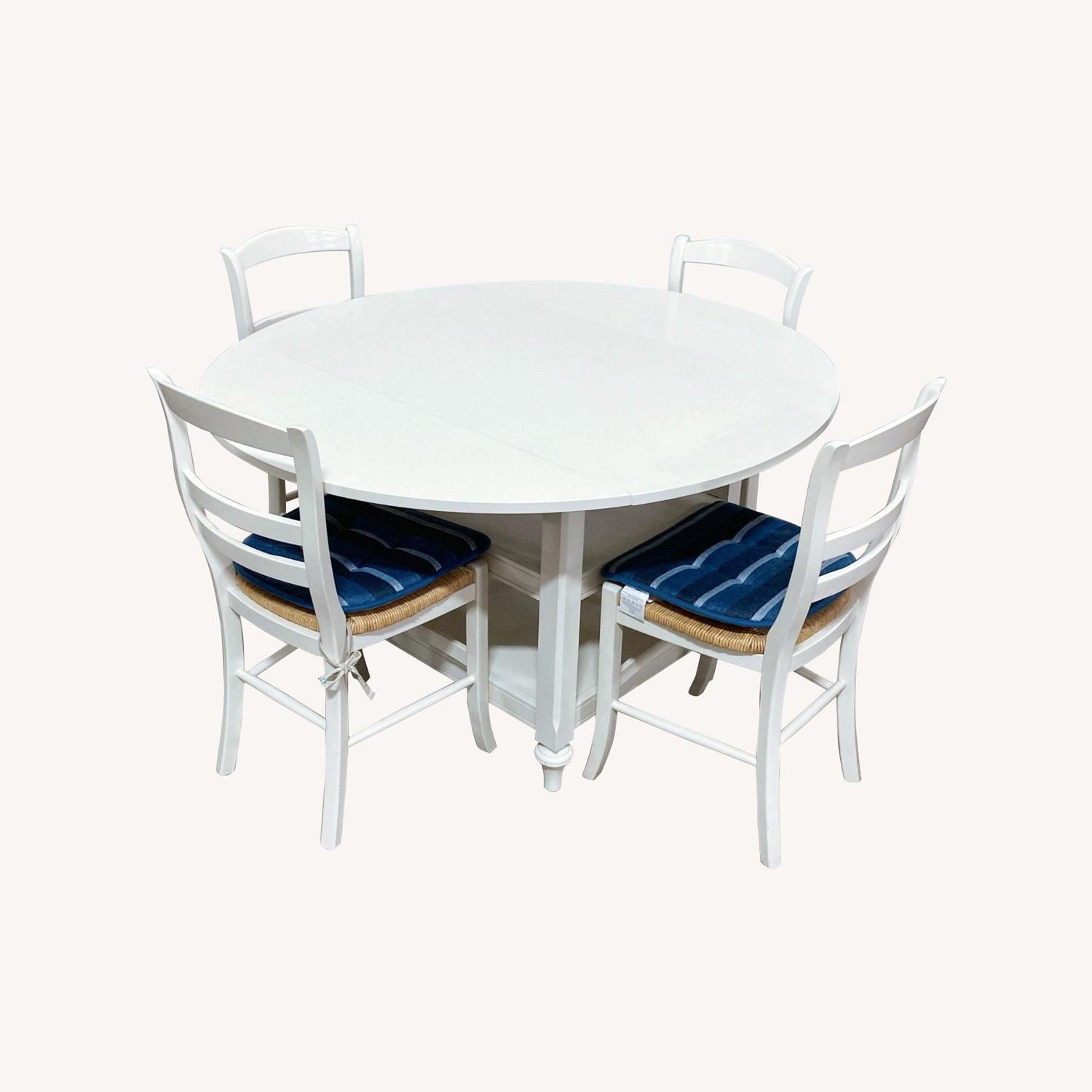 Seller's Notes:Description: This five-piece dining set from Pottery Barn features a round dining table with drop leaf sides. Included are four ladderback chairs with rush seats and removable cushions. . Brand: Pottery Barn. Material: wood. Seat heigt: 18. Retail price: $1656. Gently used - any blemishes or damage will be included in the photos. #SKU: 2014557. Tags: traditional,wood,wicker