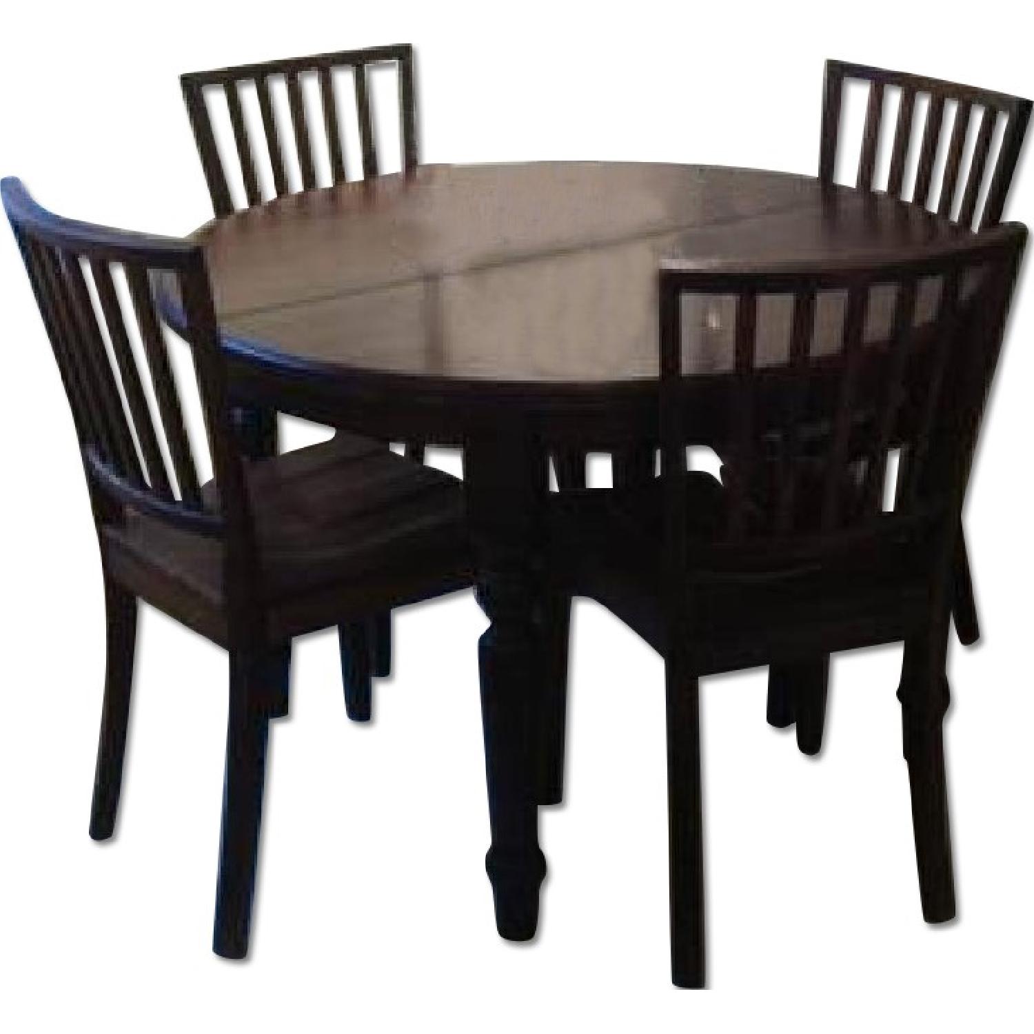 Seller's Notes:Round dining table with two extenders and four chairs for sale. Table is 45" in diameter and 30" high. Each extender is 12" wide. Price also includes four chairs. All in good condition.