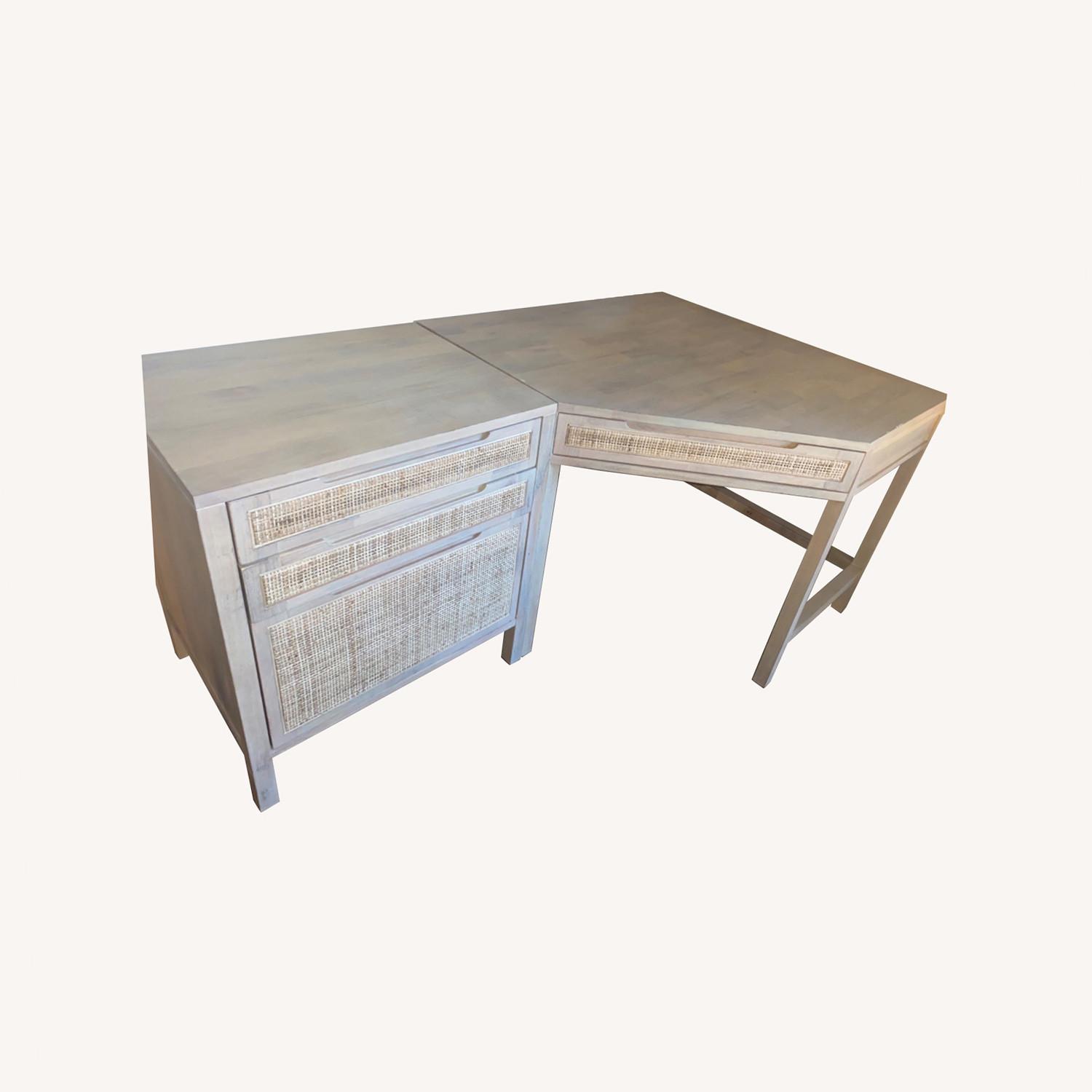 Seller's Notes:PB Dolores Cane Corner Desk and Cabinet in natural. Wood finish with cane front doors. Like new, hardly used. Style didn’t quite fit the room we wanted it for. Adjustable levers to provide stability on uneven surfaces. Spacious surface on corner desk, three drawers in filing cabinet.