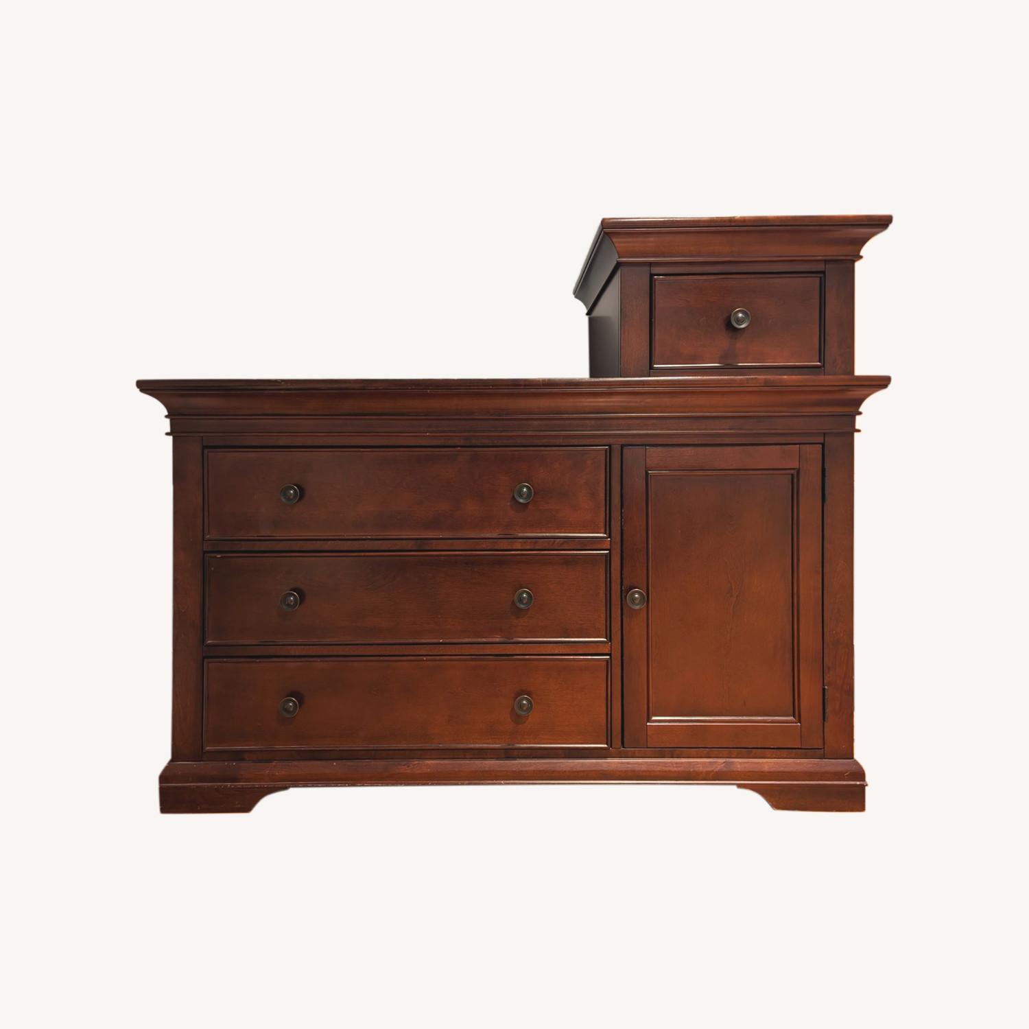 Seller's Notes:This is a beautiful piece of furniture from Pottery Barn. It is solid wood (very heavy!) with dovetail joinery, and built to last years. It has 3 main drawers, an additional top drawer for smaller items, and a pull out drawer for a laundry hamper. It's in very good condition with some minor wear along the top edge, and the veneer on the side of the top drawer face has a little bit of delamination (only visible when the drawer is open, see picture). This is the perfect size for a kids bedroom or nursery (changing pad fits perfectly on top), or an elegant addition to a guest room. We are moving the end of June and need to sell fast!