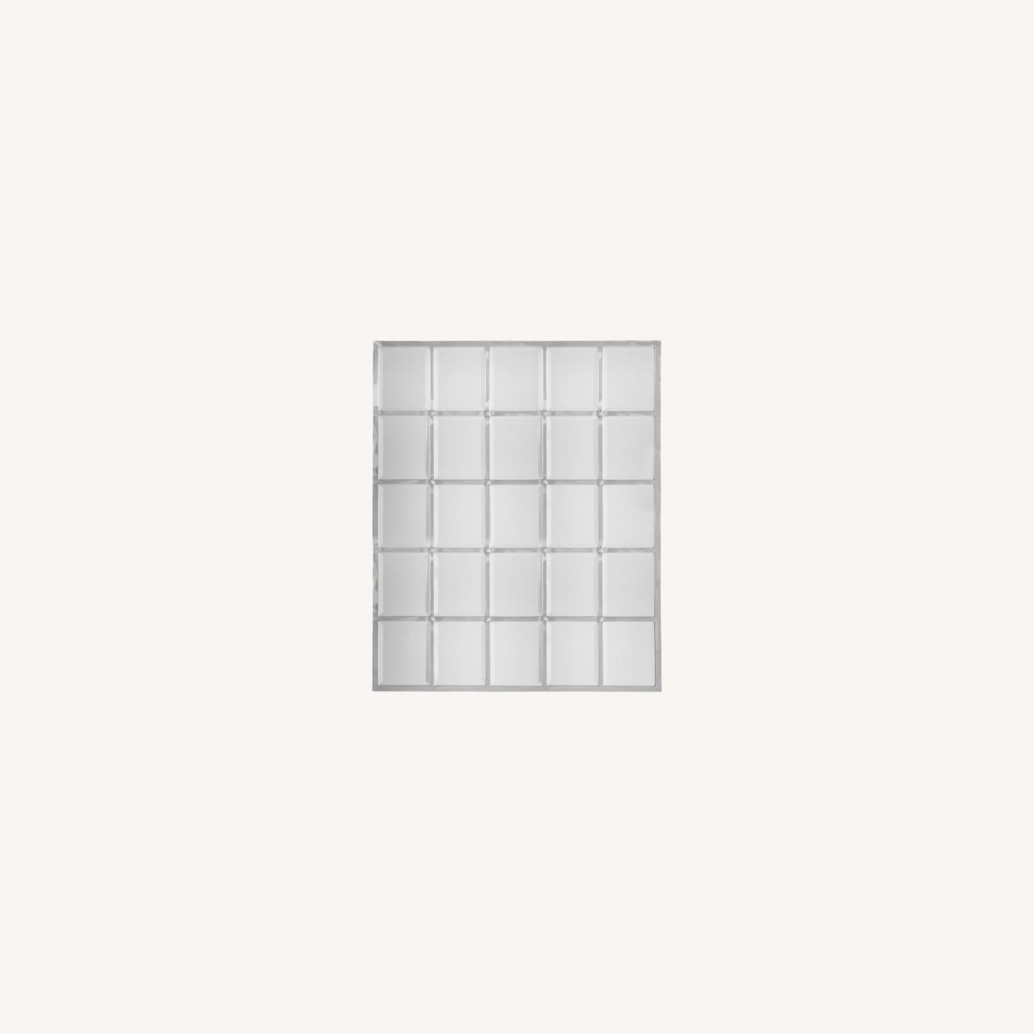 Seller's Notes:Pottery Barn Eagan Large Multi panel Wall Mirror 44" by 55" in silver. New without box. Missing Simple Mount Bracket which can be easily purchased online. Crafted with a silver finish, our Eagan Multi panel Large Mirror adds a clean graphic element to the room. Small florets where the framework intersects add stylish accents. Place it over a console in an entry or a buffet in a dining area for sparkle and style. Steel frame with a silver finish. Multi-panel design features 25 beveled mirrors. Mounts vertically or horizontally; mounting hardware is not included. Star detailing at each intersection. Mounts to wall with Simple Mount Bracket System. Imported.