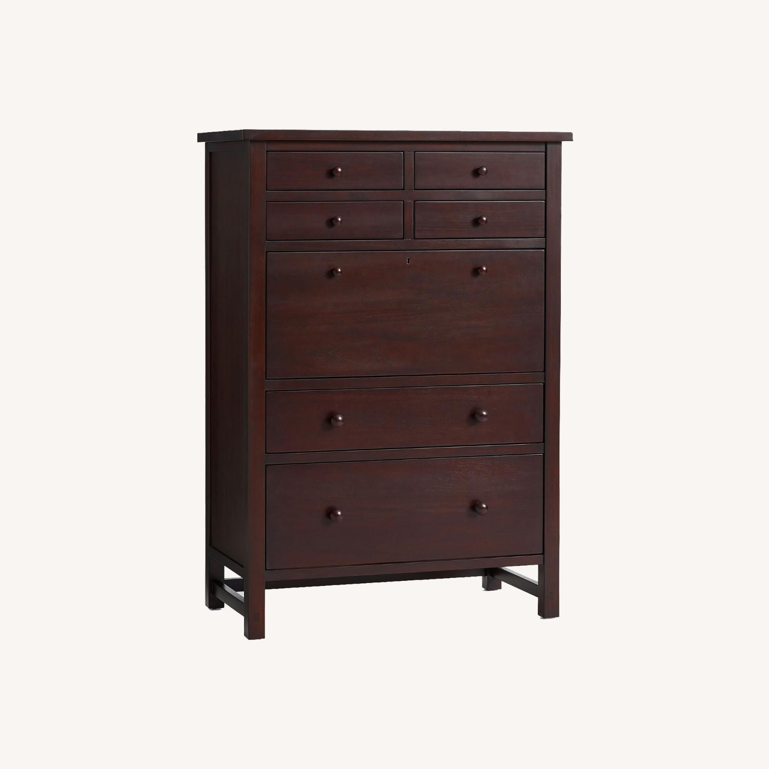 Seller's Notes:Farmhouse 40" Secretary Desk with Drawers Espresso Finish The heirloom-worthy Farmhouse Collection features classic lines, dovetail joinery and Shaker-inspired designs. Designed with storage from top to bottom, this secretary desk features six drawers plus wire management cutouts to bring order to your tasks at hand. The drop-front desk opens to reveal a spacious workstation with pigeonhole storage cubbies inside. Crafted from solid meranti wood, mahogany veneers, engineered wood and MDF. Crafted of meranti, a tropical hardwood with a long, beautiful grain. MDF is an engineered wood that lends exceptional strength and ensures the product’s structural integrity over time. Kiln-dried wood helps prevent warping, splitting, cracking and developing mildew. The use of veneers results in high-quality furniture that has flawless surfaces and consistent color tones that will not be subject to cracking. Finished by hand in oil-based Espresso finish. Secretary desk features 4 small drawers on top and 2 large drawers on bottom. Bottom drawer can hold both letter and legal size files (Divider is included). Center area houses drop down desk top with 4 side cubbies and 1 center cubby. Knobs are painted in matching colors of the desk. 5 cord cut-outs located on back.