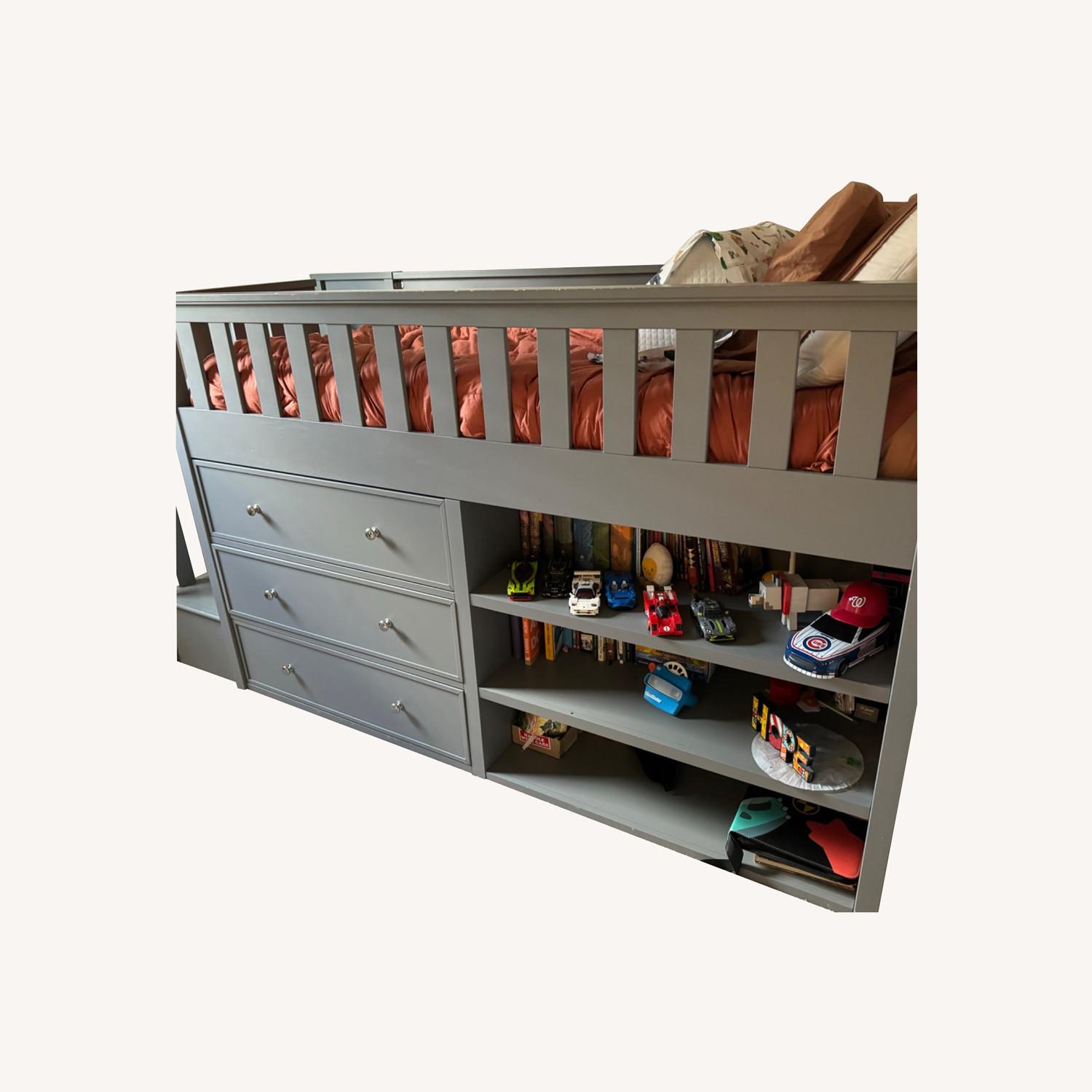 Seller's Notes:Pottery Barn Kids grey twin captains bed from the Elliott Collection. Features book shelves/nooks on two sides and three dresser drawers. In excellent used condition, no missing or loose parts, just a few light paint scratches (pictured) along top rail.