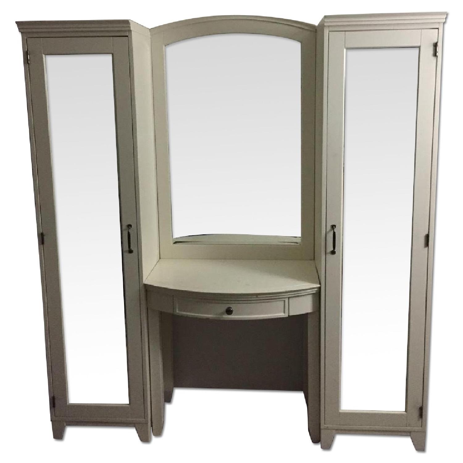 Seller's Notes:Beautiful Hampton Vanity and Towers for sale! They're much too large for my new studio! http://www.pbteen.com/products/hampton-vanity-tower-and-super-set/?pkey=cfurniture-hampton-collection%7Champton-vanities%7C&&cfurniture-hampton-collection|hampton-vanities| Master your morning routine with this expertly crafted prepping station. The vanity has a center drawer with built-in cubbies for makeup or jewelry and a tall beveled-glass mirror. 66" wide x 18.5" deep x 76" high Tower doors are backed by a corkboard with a cubby shelf and four hooks for belts, bags and more. Inside each tower are six drawers and two adjustable shelves. Towers and Vanity mirrors are detailed with a beveled edges. The Hampton Vanity Set is sold with two towers, one with a right-hinged door and one with a left-hinged door.