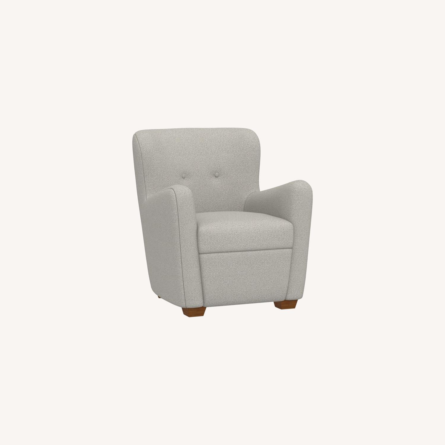 Seller's Notes:Hart Upholstered Armchair, Polyester Wrapped Cushions, Performance Boucle Pebble. Settle into the cozy embrace of the Hart Armchair, a modified petite wingback that’s bundled up in your choice of fabric. Two button tufts on the back give it dimension and detail, and the mid-size scale can be tucked into a reading nook or placed right next to the hearth. Slope arm. Fixed solid rubber wood legs are finished in Walnut. Tight cushions. Frame is expertly crafted with engineered wood and corner-block construction. No-sag steel sinuous springs provide cushion support.