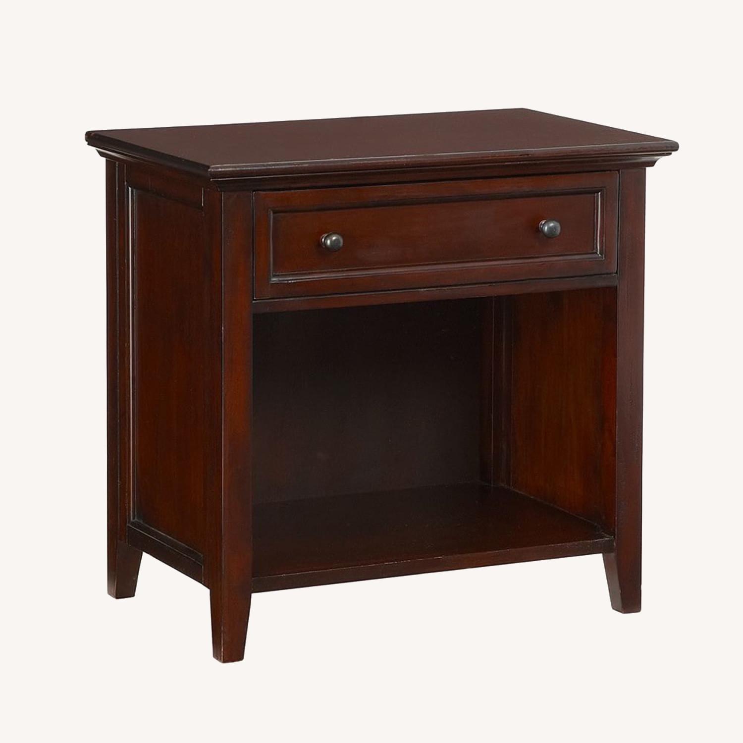 Seller's Notes:The Hudson Wide Nightstand is made of solid mahogany with dovetailed drawers and metal knobs for lasting strength. I have owned this piece for about 9 years and it’s in excellent condition (only minor scratches). It’s a sturdy piece that has a timeless feel. DIMENSIONS Overall: 32" wide x 20" deep x 30" high Drawer Interior: 23.5" wide x 15" deep x 5" high Shelf: 25" wide x 18.5" deep x 1" thick Distance between drawer underside and shelf: 17" Shelf to floor clearance: 4"