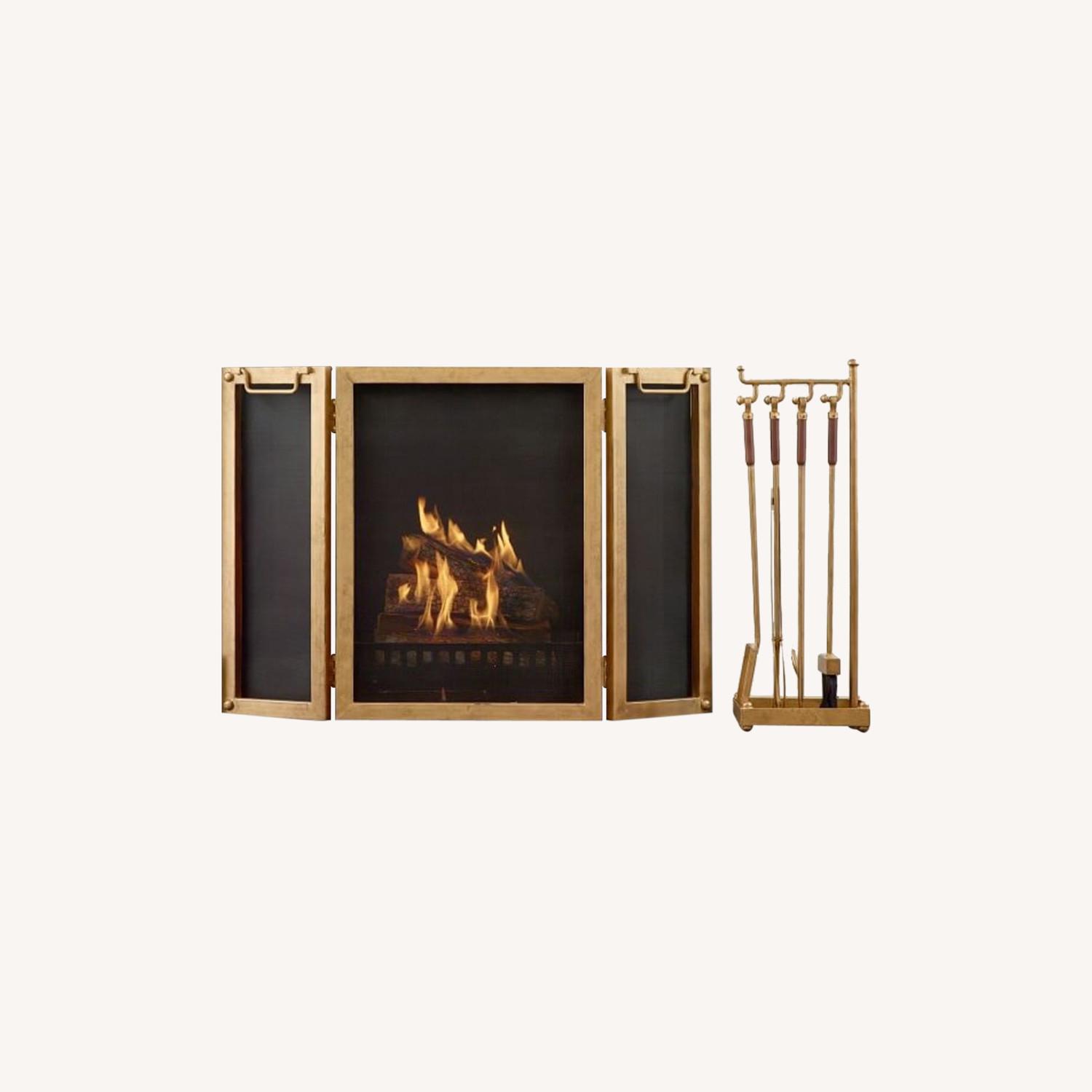Seller's Notes:Brass Finish New In Box A simple, bold frame and exposed rivets reveal the industrial inspiration for the fireplace screen. Its straightforward design lets it complement a variety of decor. Made of iron with a Brass finish.