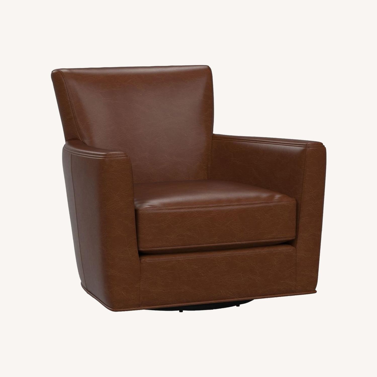 Seller's Notes:Irving Square Arm Leather Swivel Armchair Polyester Wrapped Cushions Legacy Chocolate This compact version of the classic club chair offers all the comfort of the original but in a smaller swivel chair silhouette that’s just right for a library, den or small living room. Square arm. Chair swivels 360°, does not tilt or rock. Tight back and loose seat cushion. Classic top-stitching details along the seams create a tailored style. Corner-blocked, kiln-dried hardwood frame provides exceptional structural integrity. No-sag steel sinuous springs provide cushion support. Upholstered in top-grain, aniline-dyed leather. Top-grain, aniline-dyed. Leather will lighten and soften with both use and time and develop a rich patina. Leather is a natural product. Variation in color and texture are inherent to each hide; no two pieces are exactly alike.