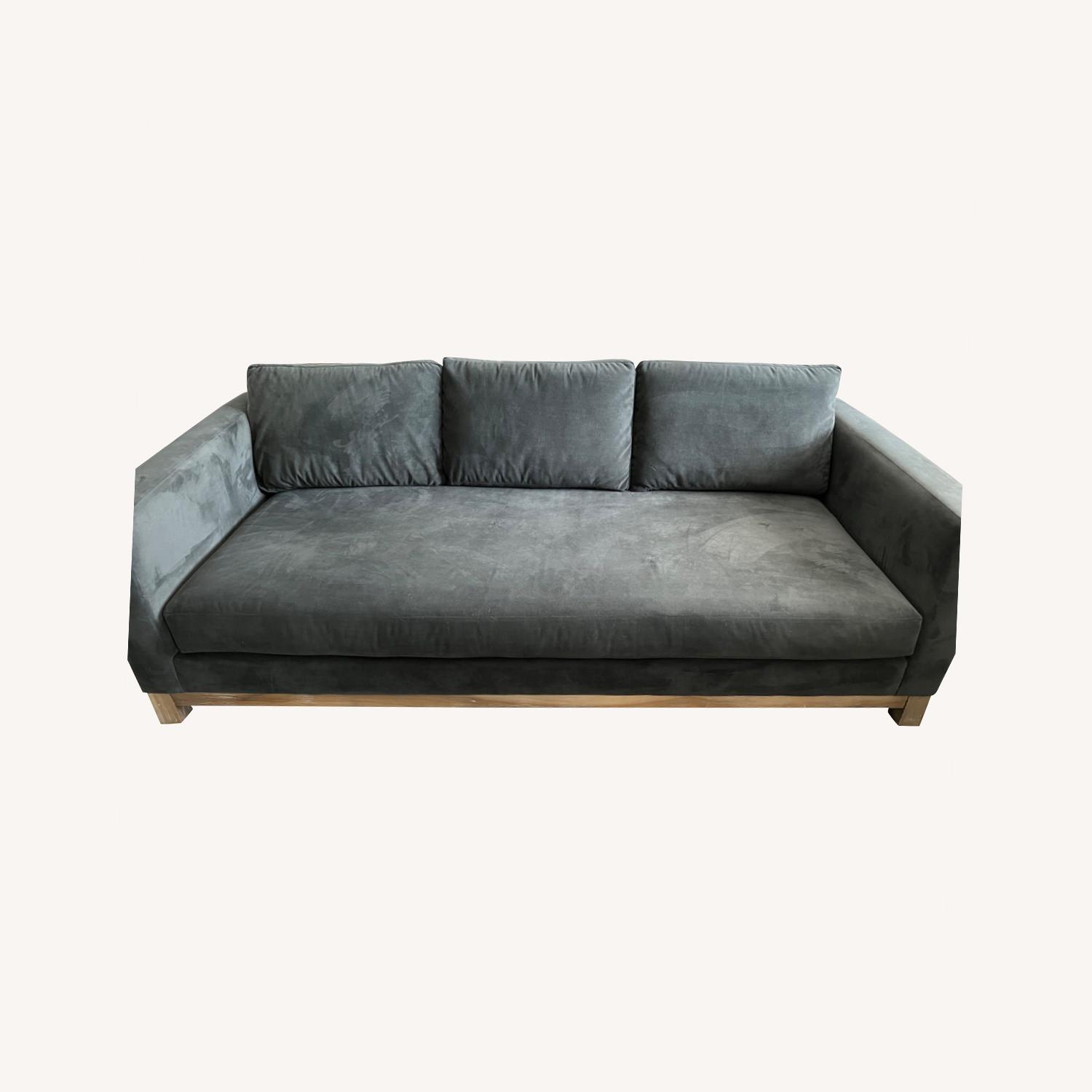 Seller's Notes:Pottery Barn Jake Upholstered Sofa 86" with Wood Legs, Polyester Wrapped Cushions, Performance Everydayvelvet™ Smoke. Sofa is roughly 2 years old, with light use, and is in excellent condition; from a non-smoking home. MSRP: $2399 Size: 86" Width Seat Cushions: Bench Seat Back Cushions: 3 Cushions Fabric and Color: Performance Everydayvelvet™, Smoke OVERALL: 86" w x 39" d x 34" h ARM: 5.5" w x 39" d x 27" h LEGS: 2.5" sq, x 5.5" h SEAT HEIGHT: 18" BACK FRAME: 27" WEIGHT: 215 lbs