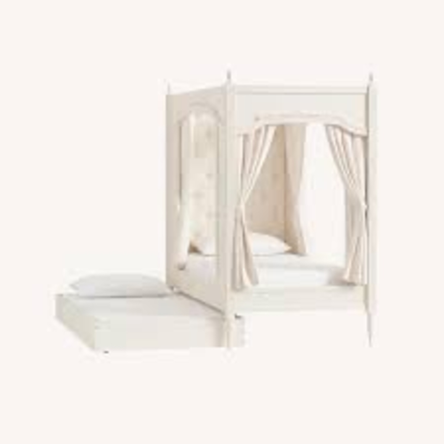 Seller's Notes:We bought this twin bed for our fifth grade daughter, but want to upgrade to an “older” girl’s bed in our new home. The twin bed is in absolute great condition because she mostly slept in her sister‘s bunk bed instead! Please note that the trundle and twin mattresses are not included. We are selling the bed frame only. *Very light ivory color