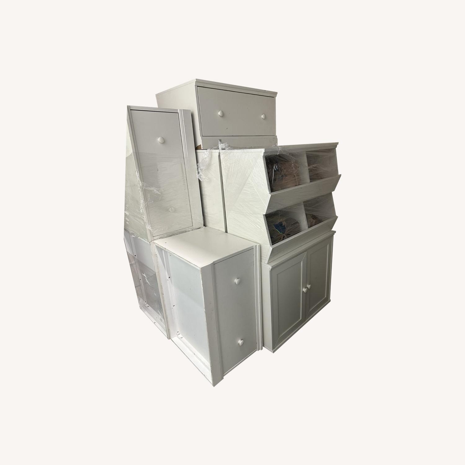 Seller's Notes:We have multiple Cameron Wall Storage Units from Pottery Barn Kids. They have been loved and some have holes on the back of them where we mounted to the wall. They can be organized and rearranged. You can see how they come together on the pottery barn website. https://www.potterybarnkids.com/products/build-your-own-cameron-wall-system/?pkey=ckids-storage-wall-systems Purchased in March 2019. 2 Cabinet with Doors ($329 each retail) 2 Cubby ( basket versus an open cubby) ($299 each retail) 1 Cubby ($299 each retail) 4 Drawer Base ($399 each retail)