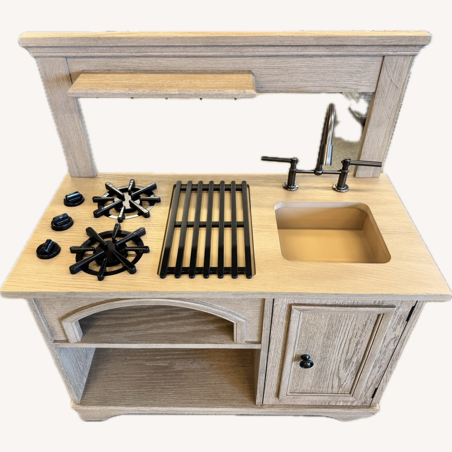 Seller's Notes:Pint-size pizza lovers will delight in their very own kitchen. Crafted of wood and distinguished by its classic American looks, Fillmore is fully equipped for hours of culinary play. Loaded with authentic features from the stovetop and sink to a range hood and open-hearth oven, it’s great for inspiring budding gourmets. HOW IT IS CONSTRUCTED Crafted of solid poplar wood and MDF with oak veneer. Hardware is made of zinc alloy in Black. Finished in child-safe, water-based paint, which provides durability. Finish is available in matte Seadrift. GREENGUARD Gold Certified to contribute to healthier indoor air, keeping you and your family safer. DETAILS THAT MATTER Fixed shelf about burners. Features 2 burners, 3 oven knobs that can turn and a fixed shelf. Sink features antique bronze faucet with cabinet storage below sink. KEY PRODUCT POINTS Pottery Barn Kids exclusive. All Pottery Barn Kids juvenile products are tested at 3rd party CPSC accredited labs to meet or exceed all industry voluntarily and regulatory safety requirements. Anti-tip kit include: comes with safety-tested mounting hardware, instructions and a nylon strap. To prevent injuries from furniture tip-over, this item should be permanently fixed to the wall. Recommended for ages 3 years and up. Assembly required. Imported.