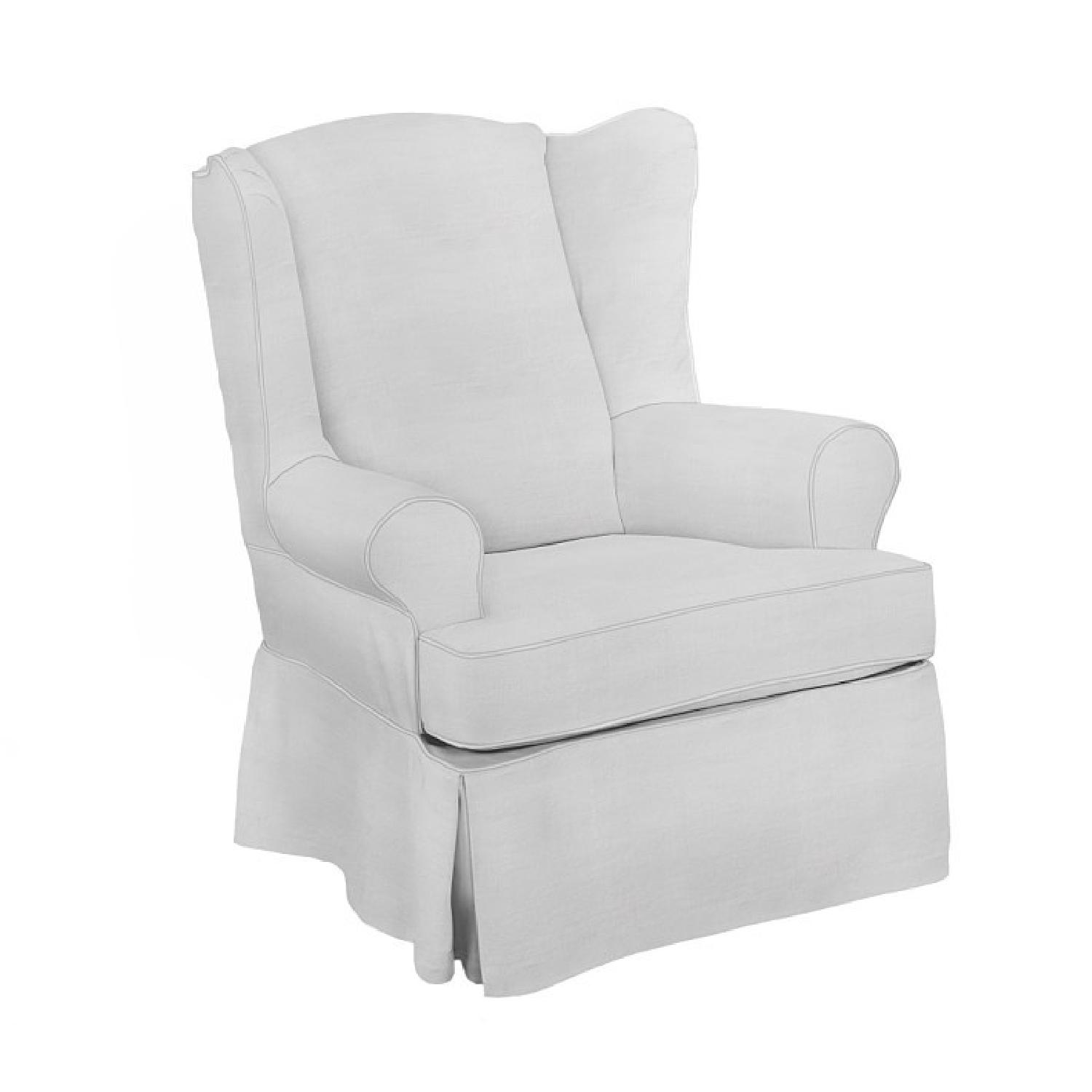 Seller's Notes:Beautiful Modern Wingback Slipcovered Glider Nursery Chair in washed linen-cotton white. We've run out of space in our NYC apartment and opted for a smaller glider in the living room to make space in the kids' room. It's a very comfortable chair - especially to rest your head on the side while rocking baby! There is a slight discoloration on the left-hand armrest from cherry Tylenol (lesson learned to use clear Advil!), but the slipcover is machine washable. It was purchased less than 3 years ago for $1,482 direct from Pottery Barn Kids.