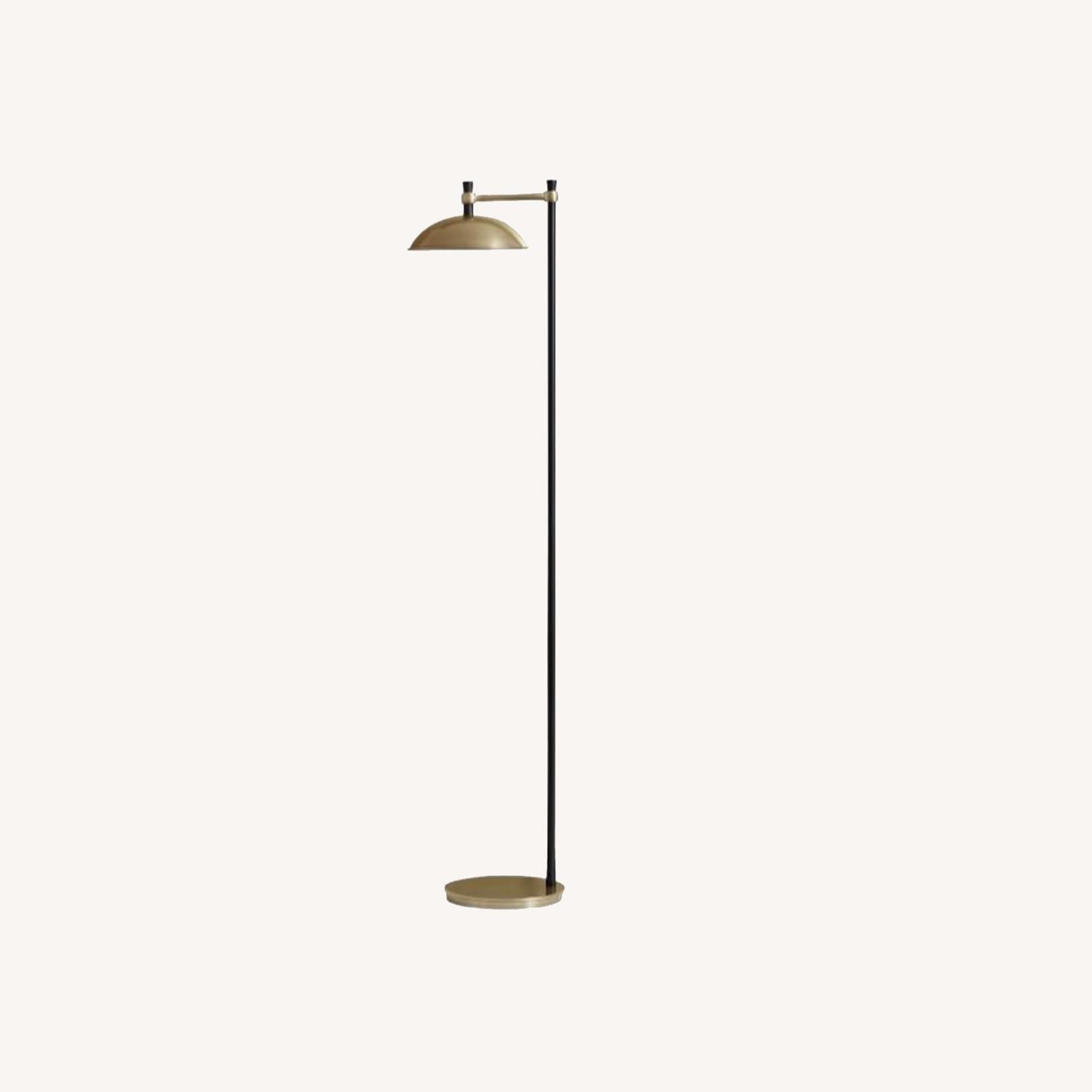 Seller's Notes:Equal parts classic and contemporary, our Leland Collection suits a range of living spaces. The floor lamp’s restrained design is enlivened by a play of lean lines joined with a circular base and shade. Crafted of iron, the sleek silhouette features brass-finished accents for a timeless feel. Crafted from brass, steel, iron and aluminum with a burnished brass and bronze finish. Features a steel shade. Black fabric cord cover. Plug in.