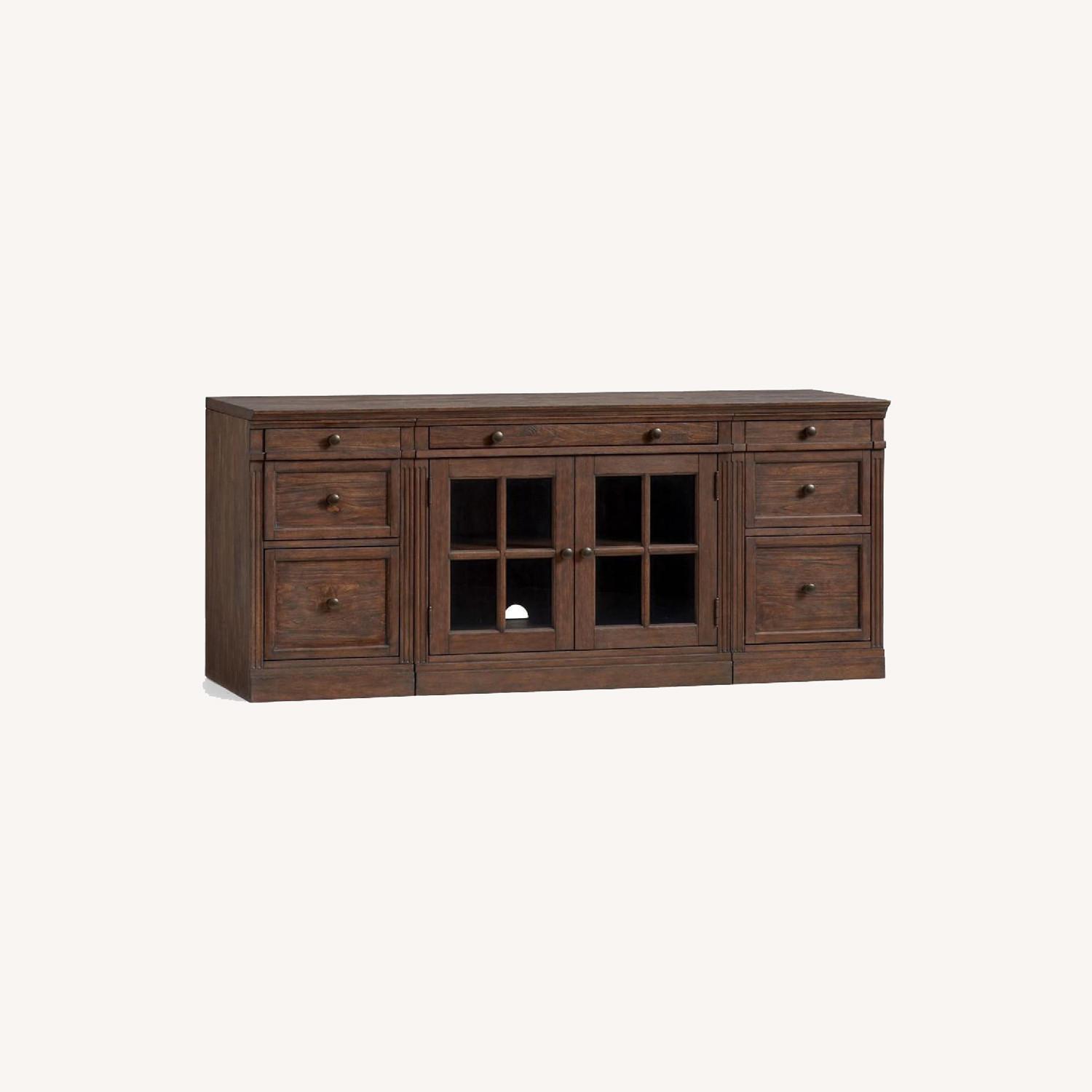 Seller's Notes:Pottery Barn Livingston Media Console Color: Brown Wash Glass Door Cabinets are detailed with cord management. Glass Door Cabinets each feature 1 thin drawer and 1 shelf that can adjust to 7 different heights. Made of kiln-dried solid meranti wood and veneer. Glass doors are made of tempered glass. Features artisan-crafted details such as solid wood drawer boxes crafted with English dovetail joinery and smooth ball bearing glides. Brown wash is accentuated with Antique Bronze hardware Adjustable levelers help with stability on uneven surfaces. Imported. Wipe up spills immediately with a soft, dry cloth. Clean glass with standard glass cleaner. Do not use harsh or abrasive chemicals as this may damage the finish.