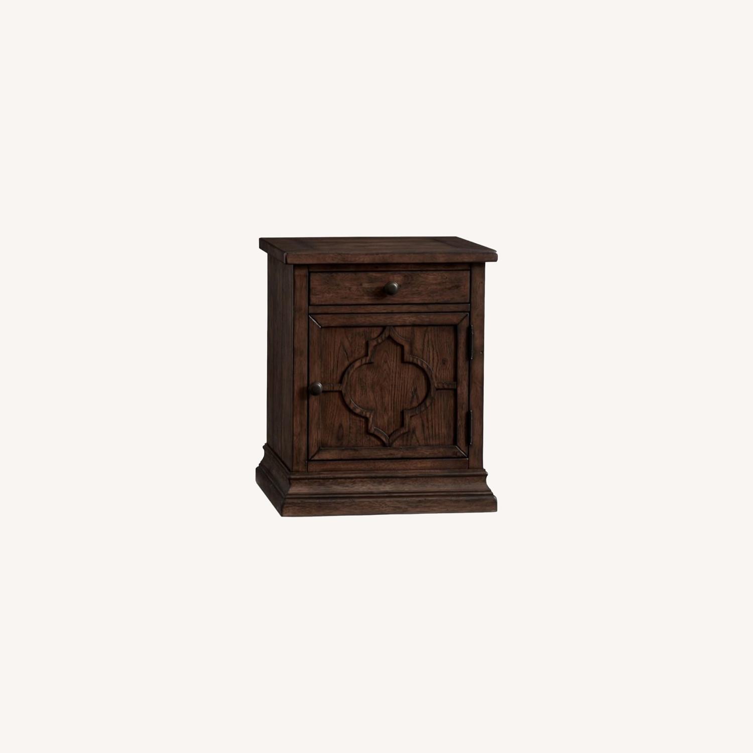 Seller's Notes:Frame-and-panel construction with mitered corners attests to the rustic good looks of this end table. Part of our Lorraine Collection, it’s inspired by traditional Spanish furniture, built in a bold scale with a quatrefoil overlay on the front and resting on a plinth base. Crafted from solid wood with veneers. Features an Antique Hewn Oak, Rustic Brown, Midnight Black, Seadrift or Gray Wash stained finish on all sides. Kiln-dried wood helps prevent warping, splitting, cracking and developing mildew. The use of veneers results in high-quality furniture that has flawless surfaces and consistent color tones that will not be subject to cracking. Features artisan-crafted details such as solid wood drawer box crafted with English dovetail joinery and smooth ball-bearing glides. Features a hand applied antique stained finish. Magnets keep the bottom door closed. Adjustable levelers provide stability on uneven surfaces.