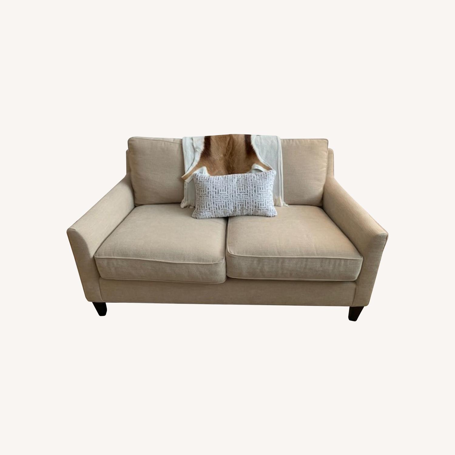 Seller's Notes:Pottery barn Beverly Upholstered Love Seat in great condition! Polyester Wrapped Cushions Fabric: Performance Tweed Desert (Beige) Please note that blanket and pillow featured in pictures are not included in the sale. Dimensions: Depth: 35" Length: 55" (at the back) and 59" (at the front) Height: 18.5" (to seat) and 30.5" (to back)
