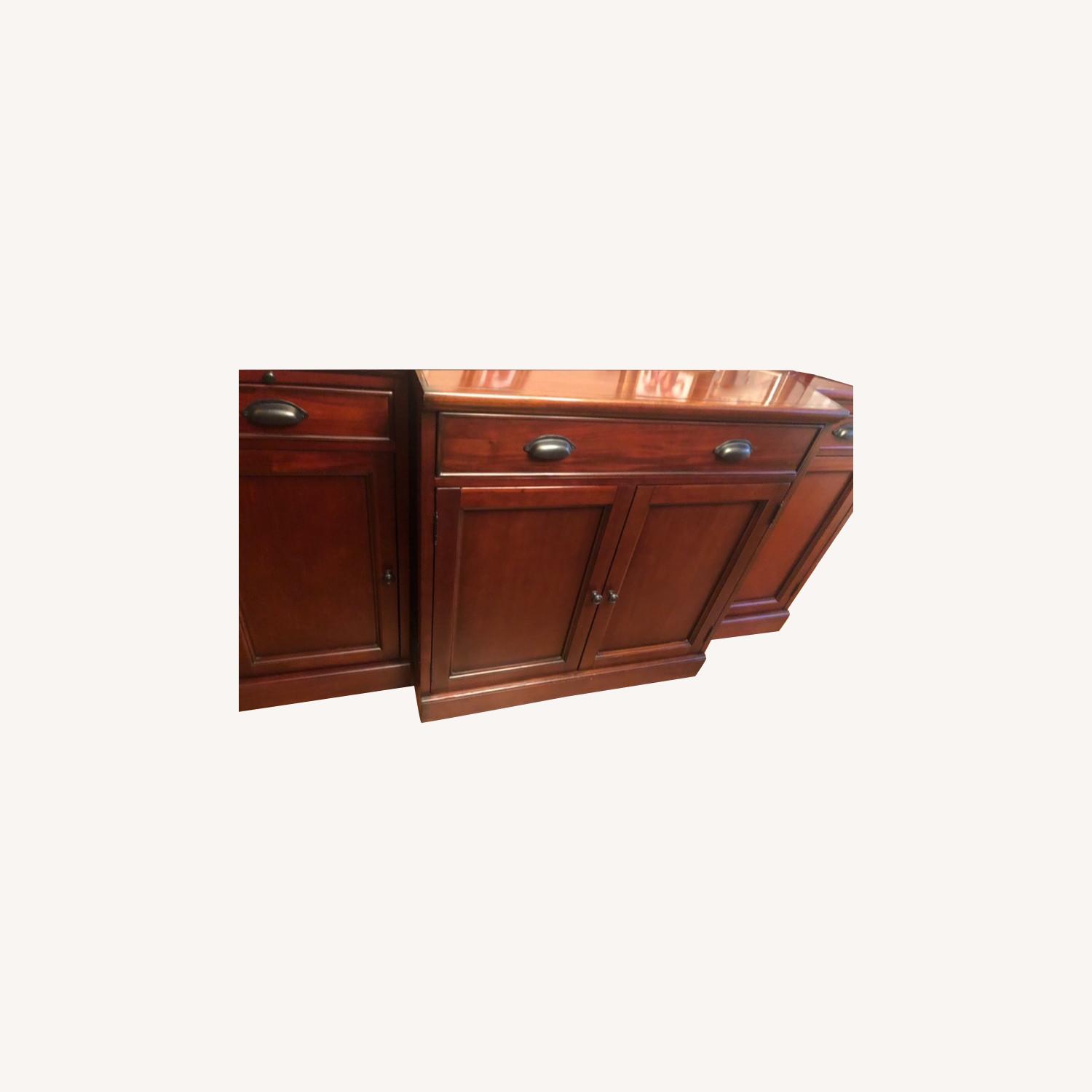 Seller's Notes:Bought at pottery barn. Mahogany finish. 3 pieces put together. Beautiful piece. Center piece has scratch on top but will easily be covered with a picture frame or decoration. Well made. Solid wood. No stairs to walk up. Easy transfer to vehicle.