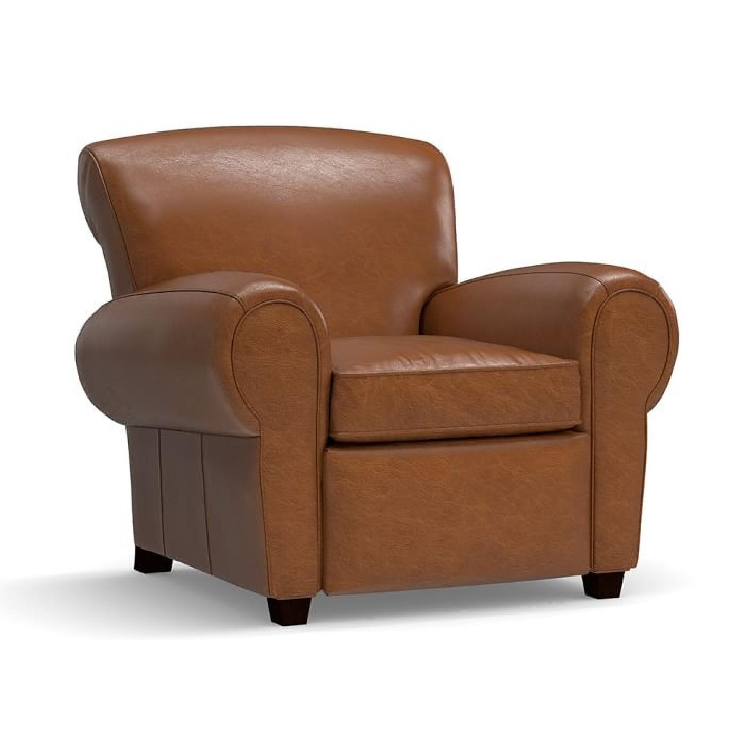 Seller's Notes:Selling because of a move. This is a beautiful Pottery Barn leather chair, that is incredibly comfortable and cozy. Deep seat and well-padded arms, with a high back. Minor wear, only 2 years old. A Pottery Barn classic!