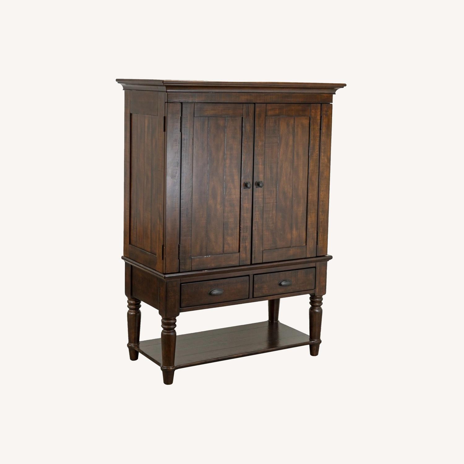 Inspired by bold industrial furniture, this armoire is cleverly designed to store all of your media components. HOW IT'S CONSTRUCTED - Expertly crafted from thick planks of pine; meticulously weathered and distressed. - Finished by hand using an exclusive multistep process that results in exceptional depth of color, then sealed with a protective lacquer. - Fitted with antique-bronze door pulls. - Detailed with grooves to create the look of salvaged lumber. DETAILS YOU'LL APPRECIATE - Side-by-side cubbies hold electronics; use drawers for storage. - Cord cutouts in back for wire management. - Wraparound doors allow for unobstructed viewing. - Finished with substantial crown molding and turned legs with carved details. KEY PRODUCT POINTS - Accommodates up to a 42" flat-screen monitor. - 48" wide x 24" deep x 67" high - Adjustable levelers add stability on uneven floors.