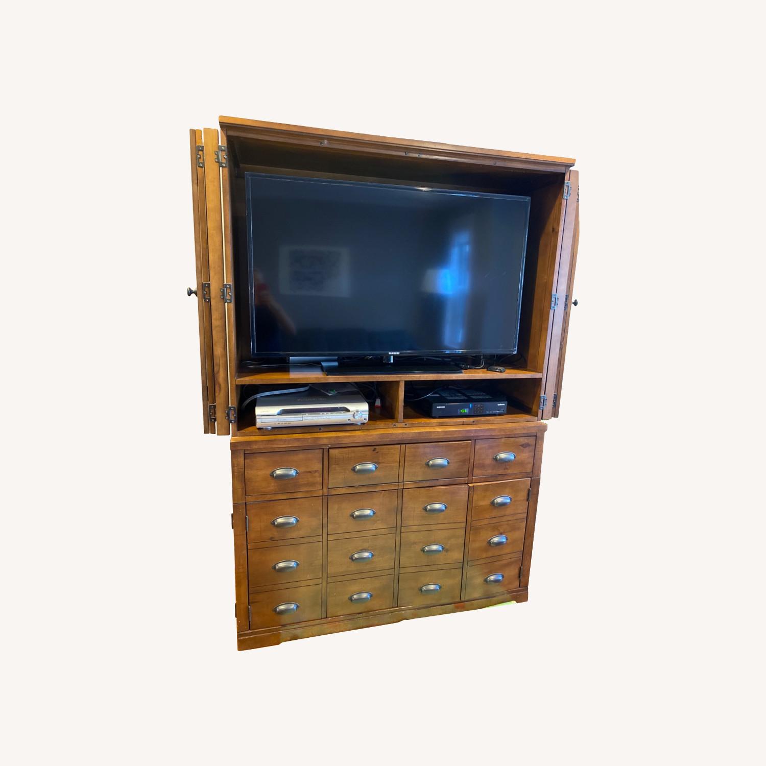 Seller's Notes:Had many good years with this media hutch. Holds tv. Has a drawer for other electronics below tv and two drawers in either side. The entire piece opens up in two side doors below with several shelves of storage storage inside. Doors close and hide everything inside. The top doors open to show entire tv or close to hide it. It’s in good condition. Some scratches only visible close up.