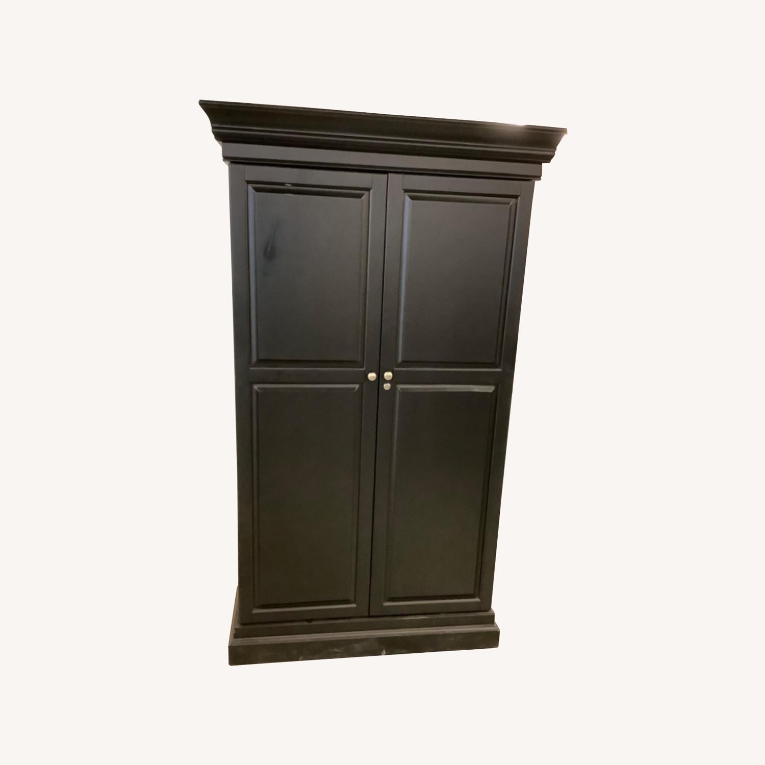 Seller's Notes:1 Scratch on front - repairable. Impressive in stature as well as function, the Melinda Bar Cabinet is made for grand-scale entertaining. It offers a magnificent amount of storage for stemware, bottles, small appliances and more. It features an electrical outlet for mixers, immersion blenders or chargers, and a removable glass workstation allows you to prepare signature cocktails, then take it to the sink for easy cleanup. Glass holders at the top of the unit keep stemware clean and dust-free, and cubbies at the base keep wine bottles safe and protected. Each door has built in shelving for more storage, and two roomy drawers in the center hold bar tools, towels, coasters and more. As a final stroke of genius, ambient lighting activates whenever a door is opened, and turns off when the doors are closed. Features 2 fixed glass shelves, 8 stemware racks, 2 spacious drawers for storage, 14 wine bottle racks and a large mirror on the bar. 2 cabinet doors includes 8 shelves for bottle storage and magnetic closures. Lights above mirror include 25W Type R bulbs and comes with 6’ long plug-in cord. Cabinet includes crown molding on top and molded door panels for an elegant and timeless look. Made of solid poplar, MDF, birch and cherry veneers in a hand applied black or brown finish. Kiln-dried wood helps prevent warping, splitting, cracking and developing mildew. The use of veneers results in high-quality furniture that has flawless surfaces and consistent color tones that will not be subject to cracking. MDF is an engineered wood that lends exceptional strength and ensures the product’s structural integrity over time. Constructed with mortise-and-tenon joinery for structural integrity. Hardware features a Brushed Nickel on the black finish and charcoal on the brown finish. Drawers feature English dovetail joinery and waxed wooden glides, which ensure smooth motion. Sturdy half-moon safety stops keep drawers securely in place. DIMENSIONS: Overall: 43" w x 23" d x 74" h Door (2): 18.75" w x 5.5" d x 61.5" h Door Pull (2): 1" dia Main Compartment without Shelves: 35.5" w x 14.75" d x 28.75" h Top Interior Shelves (2): 35.5" w x 13.5" d x 0.5" t Distance between Shelves: 15" h Drawer Interior (2): 16.5" w x 12.75" d x 4" h Wine Grid: 34" w x 14.5" d x 10.5" h Wine Bottle Compartments (14): 4.75" w x 14" d x 4.75" h Mirror: 36" w x 27" h x 0.25" t Bulbs (3): 25W Type R (included) Cord: 6’ long Top Weight Capacity: 165 lbs Shelf Weight Capacity: 175 lbs Wine Rack Weight Capacity: 66 lbs Door Shelf Weight Capacity: 60 lbs Drawer Weight Capacity: 77 lbs Weight: 149 lbs