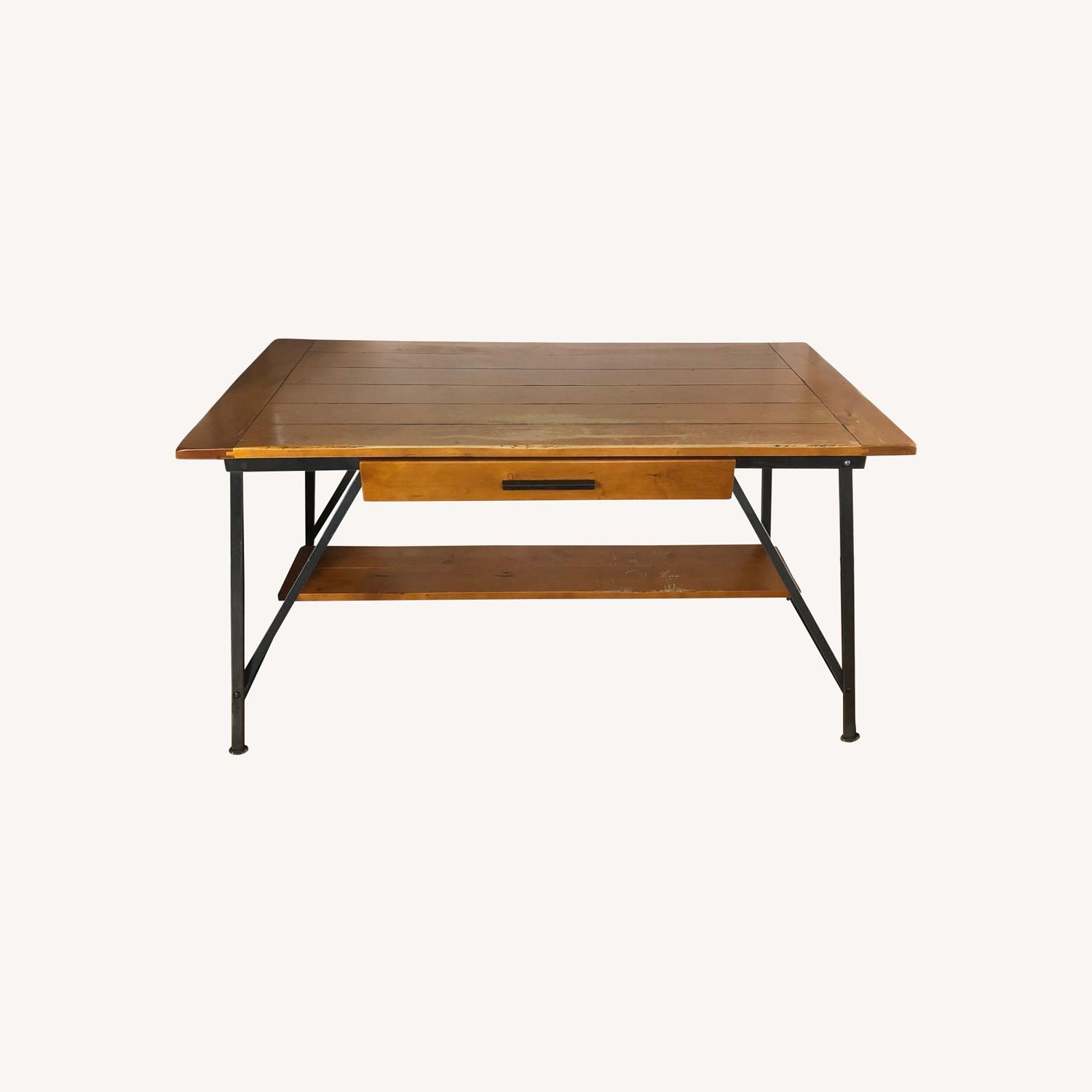 Seller's Notes:A friend gave me this Pottery Barn desk from about 15 years ago when he downsized. It's made of warm chestnut-looking wood with modern black metal accents. The drawer can be pulled down to allow for a keyboard. It has scratches on the top part of the desk and on the shelf underneath. I've enjoyed using it - I think it's the perfect size for a crafting or other work desk, but unfortunately it won't fit in my new apartment.