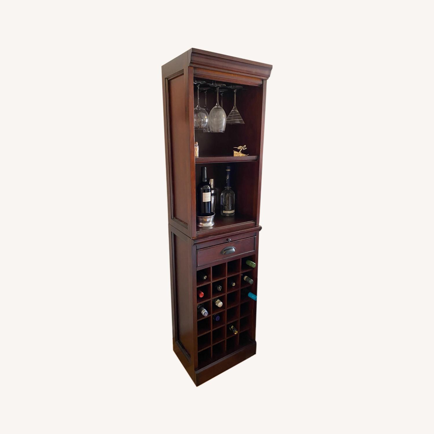 Seller's Notes:Organize, store and display entertaining essentials. Mahogany hardwood wine display rack holds up to 24 bottles horizontally, suspends 6 wine glasses on the top rack and countless entertainment items on the lower shelf. The pullout drawer provides privacy for other essentials. And a pullout shelf is the perfect additional space to prepare mixed drinks. The top hutch separates from the base. The base is slightly wobbly but stands sturdy with a small matchbook. There is some chipping on the corner of the top pieces as shown. Base is 36" tall and hutch 34" combined stands 70" tall.