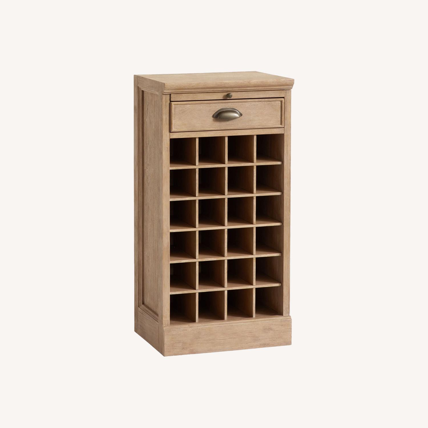 Seller's Notes:Store and display your entertaining essentials in our Modular Wine Bar, a stylish alternative to built-in cabinetry. Constructed of hardwood with mahogany veneer, the drawer grid features bottom-mounted wood runners and plastic stops. Framed in mahogany with a top and back panel made of hardwood with mahogany veneer. The shelf in the hutch is MDF with Mahogany veneer; the wine-glass rack inside is constructed of steel. MDF is an engineered wood that lends exceptional strength and ensures the bar's structural integrity over time. The use of veneers results in high-quality furniture that has flawless surfaces and consistent color tones, and that will not be subject to cracking. Mahogany stain is hand finished on all sides with a lightly distressed finish sealed with lacquer for durability and moisture resistance. Seadrift finish is accomplished by hand using an exclusive technique that results in exceptional depth of color, then sealed with a protective lacquer. The Cabinet Base has 1 adjustable shelf, and a door that can be configured to open to the left or right. Open Hutch has three steel stemware racks that can hold between six and nine wine glasses. The Wine Grid Base accommodates 24 bottles; wine grid is not removable, and it may not accommodate champagne or magnum bottles because of their size and/or shape. Made of brass, the drawer pulls have an antique-bronze finish. Features adjustable levelers for stability. Imported.