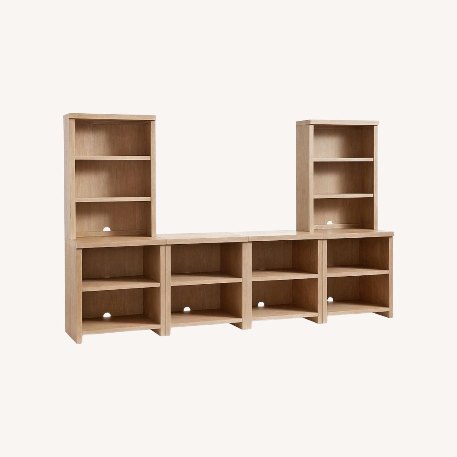 Seller's Notes:Beautiful Pottery Bar modular wall system configured as a media/storage wall. Includes (4) lower base cabinets, each 34” wide with full back panels, plus (2) tall shelving towers. Total width approximately 136”. Finished in a light oak / natural wood tone. Extremely versatile for media, toy storage, books, or living room display. Originally purchased from Pottery Barn as a modular system. Excellent condition with normal light wear.