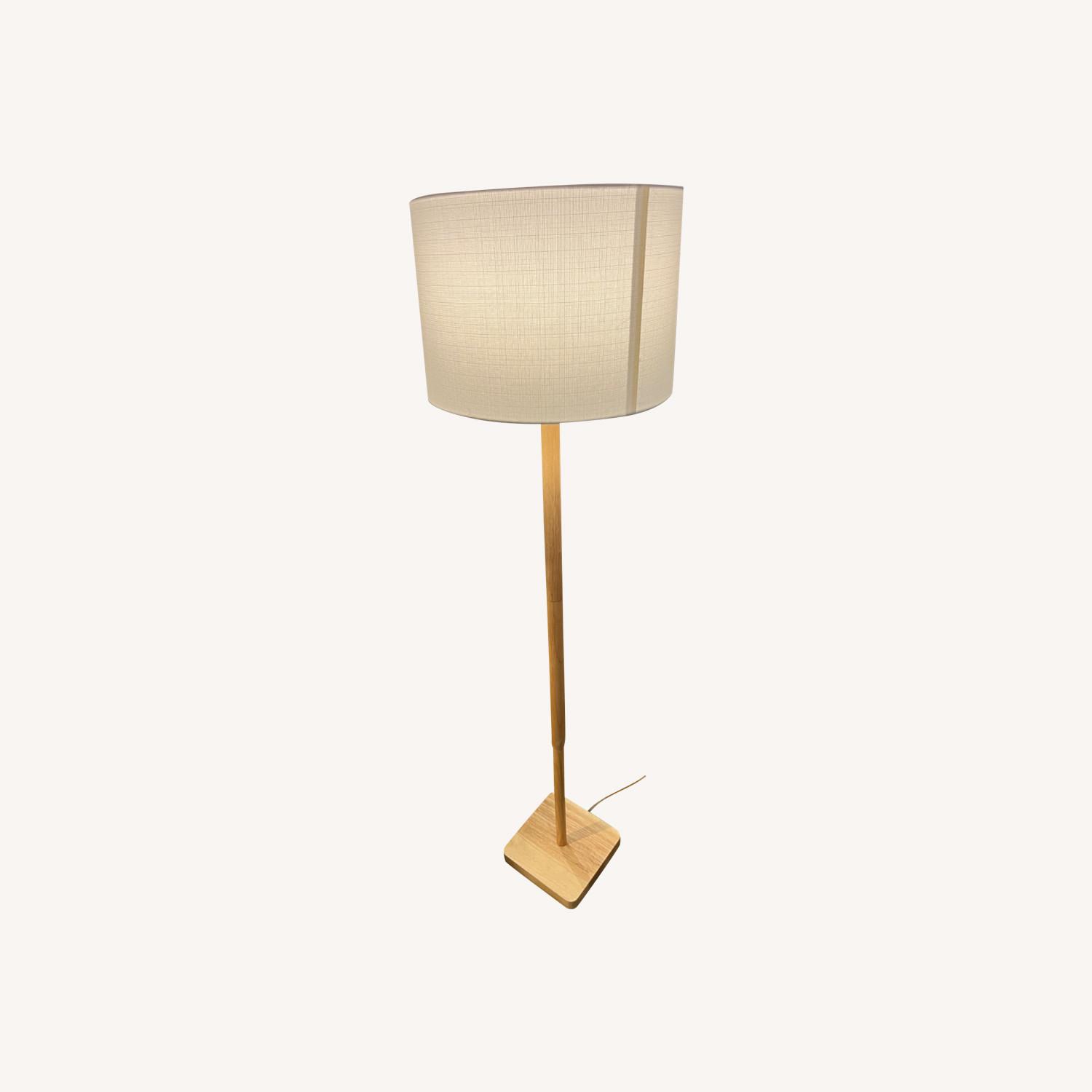 Seller's Notes:Simple but elegant contract grade wood floor lamp with beautiful shade. ~RL
