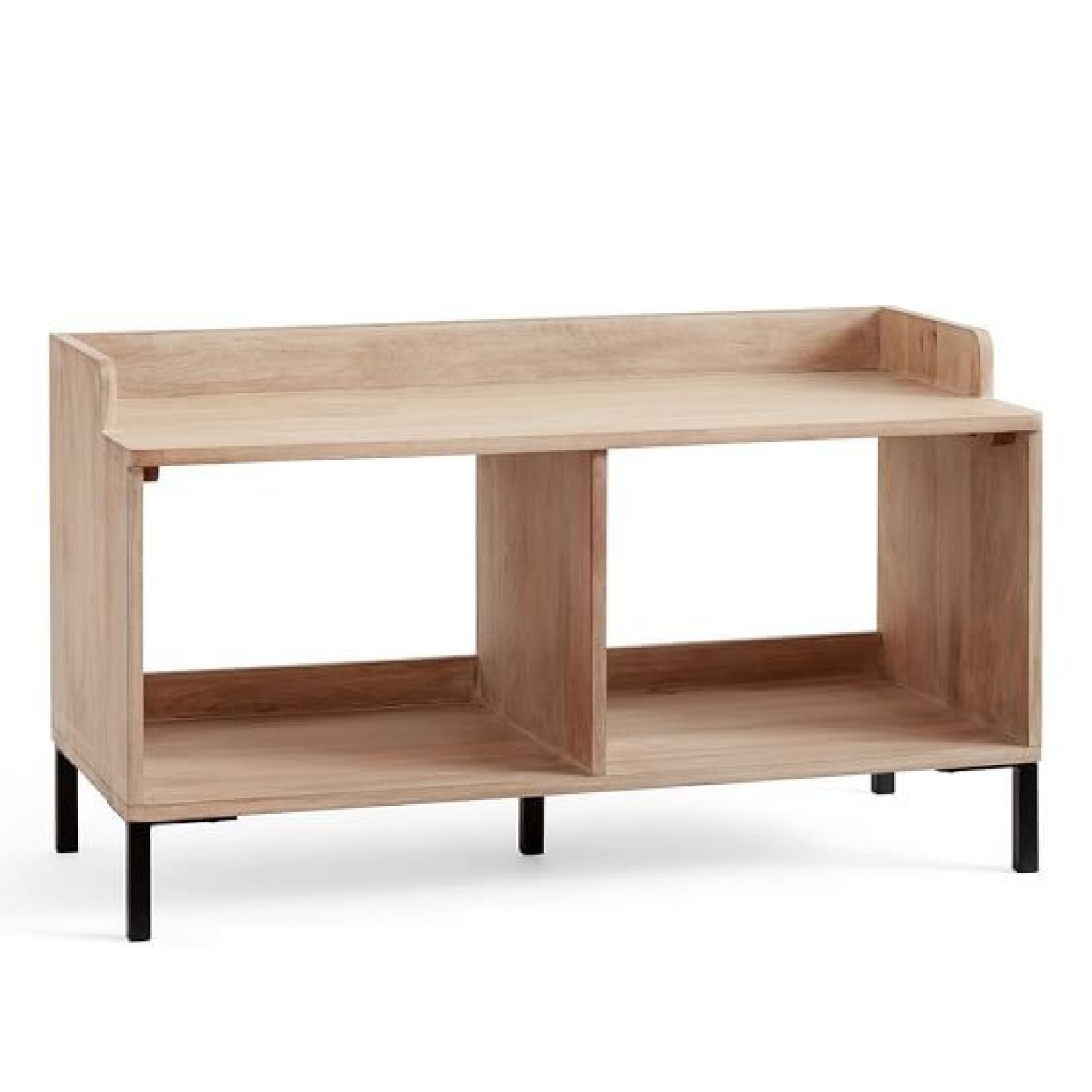 Seller's Notes:Bought for our new apartment but does not fit. It wound up being too wide for our hallway due to the angles also they stained our wood floors a warmer color from the darker brown we originally thought was in the place so this natural wood bench clashes with it. Please check out the link provided as this is the exact look of it. You can put cute little boxes in the open spaces or just shoes. Overall (including backrest): 34" wide x 15" deep x 19.5" high Seat: 34" wide x 14.5" deep Cubby Interior (2): 16" wide x 13.5" deep x 11.5" high Backrest: 2.5" high Distance Between Legs: 32" front to back; 13" side to side Weight Capacity: 173 pounds Weight: 27 pounds With the bench we also purchased a cushion from Pottery Barn. I emailed them because I no longer see it listed onilne even though you can see in the pictures its the same one. That cushion cost us $33. So we wanted to offer the set for what the bench just costs.