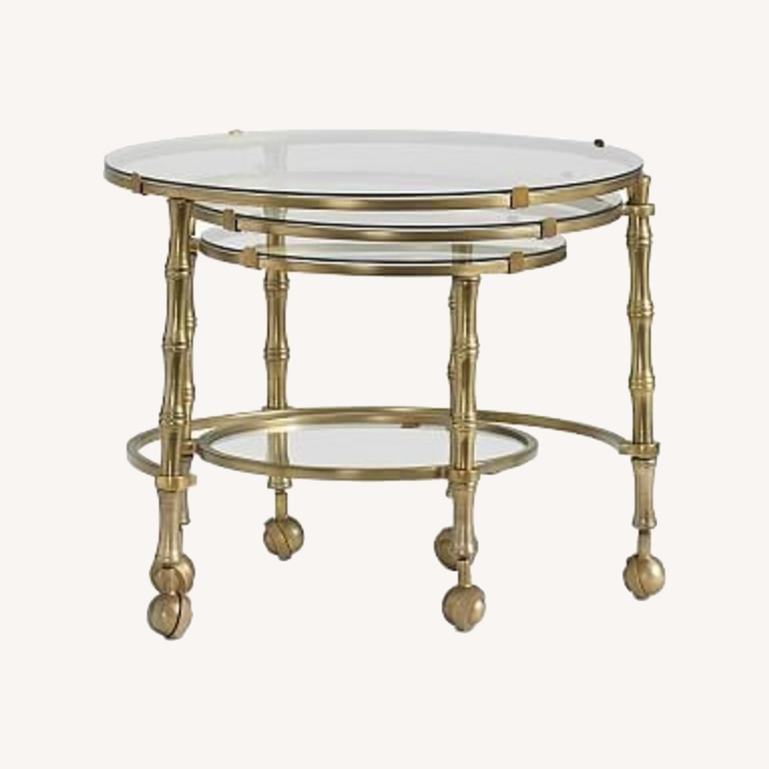 Seller's Notes:Circular glass coffee table from Pottery Barn. No longer listed on their website. Glass surfaces nest inside one another so the size varies depending on how it's set up. The smallest table has two glass shelves. The table rolls on casters for easy nesting and moving, and the glass panes come out for cleaning.