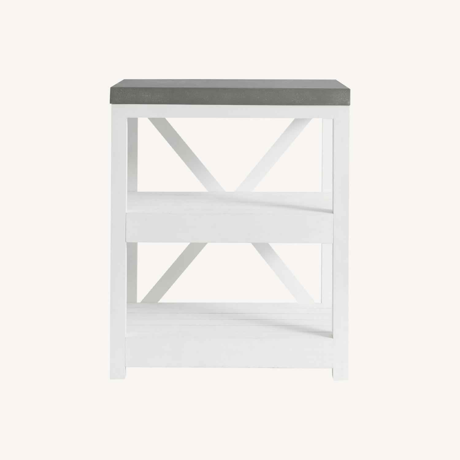Seller's Notes:Crafted from pine wood, MDF and steel. Frame is finished in White with a powder-coated Zinc top. Features 3 fixed shelves. Made in a Fair Trade Certified™ factory, supporting fair and safe labor practices and empowering workers to invest in their communities. Workers receive extra funds for every product sold which are used for community projects chosen by workers. Imported. Dust often using a clean, soft, dry and lint free cloth. Blot spills immediately with a clean, damp cloth. Do not use chemicals, abrasives or furniture polish on lacquered finish.